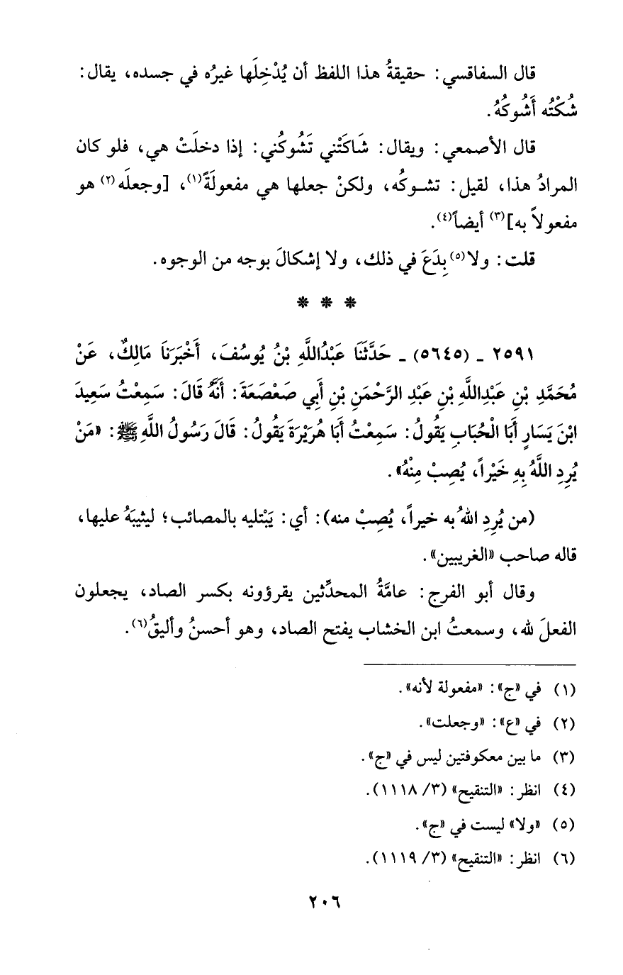 وقال أبو الفرج: عامَّةُ المحدِّثين يقرؤونه بكسر الصاد، يجعلون الفعلَ لله، وسمعتُ ابن الخشاب يفتح الصاد، وهو أحسنُ وأليقُ (¬6).