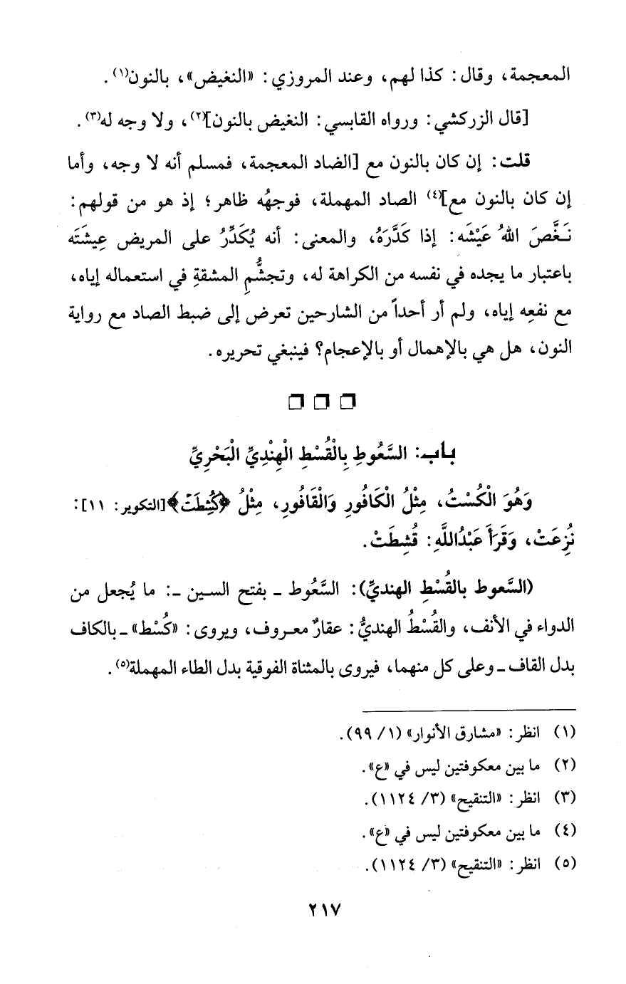 (السَّعوط بالقُسْطِ الهنديَّ): السَّعُوط - بفتح السين -: ما يُجعل من الدواء في الأنف، والقُسْطُ الهنديُّ: عقارٌ معروف، ويروى: "كُسْط" - بالكاف بدل القاف - وعلى كل منهما، فيروى بالمثناة الفوقية بدل الطاء المهملة (¬5).