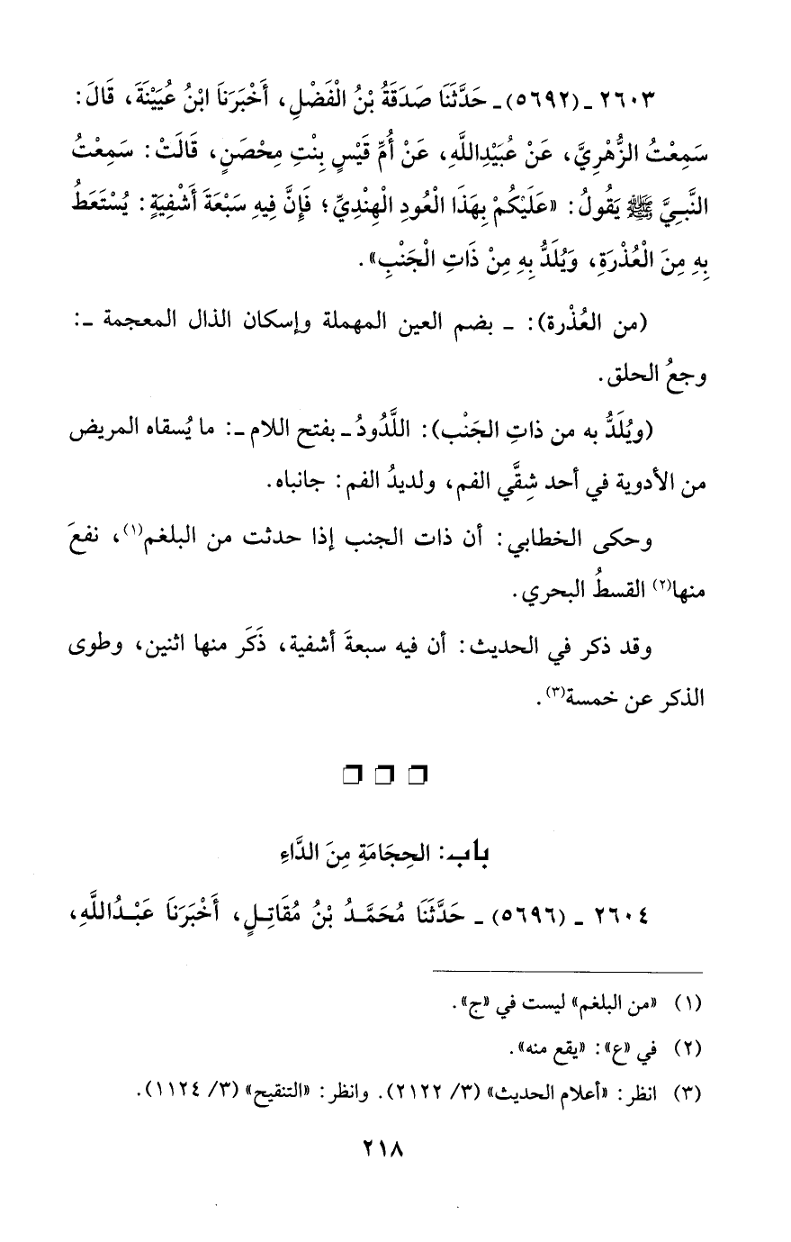 2603 - (5692) - حَدَّثَنَا صَدَقَةُ بْنُ الْفَضْلِ، أَخْبَرَنَا ابْنُ عُيَيْنَةَ، قَالَ: سَمِعْتُ الزُّهْرِيَّ، عَنْ عُبَيْدِ اللَّهِ، عَنْ أُمِّ قَيْسٍ بِنْتِ مِحْصَنٍ، قَالَتْ: سَمِعْتُ النَّبِيَّ - صلى الله عليه وسلم - يَقُولُ: "عَلَيْكُمْ بِهَذَا الْعُودِ الْهِنْدِيِّ؛ فَإِنَّ فِيهِ سَبْعَةَ أَشْفِيَةٍ: يُسْتَعَطُ بِهِ مِنَ الْعُذْرَةِ، وَيُلَدُّ بِهِ مِنْ ذَاتِ الْجَنْبِ".