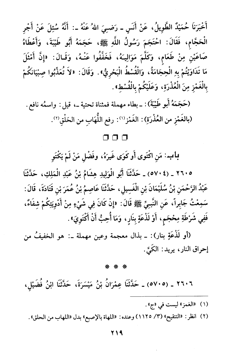 أَخْبَرَنَا حُمَيْدٌ الطَّوِيلُ، عَنْ أَنَسٍ - رَضِيَ اللهُ عَنْهُ -: أَنَّهُ سُئِلَ عَنْ أَجْرِ الْحَجَّامِ، فَقَالَ: احْتَجَمَ رَسُولُ اللَّهِ - صلى الله عليه وسلم -، حَجَمَهُ أَبُو طَيْبَةَ، وَأَعْطَاهُ صَاعَيْنِ مِنْ طَعَامٍ، وَكَلَّمَ مَوَالِيَهُ، فَخَفَّفُوا عَنْهُ، وَقَالَ: "إِنَّ أَمْثَلَ مَا تَدَاوَيْتُمْ بِهِ الْحِجَامَةُ، وَالْقُسْطُ الْبَحْرِيُّ". وَقَالَ: "لاَ تُعَذِّبُوا صِبْيَانَكُمْ بِالْغَمْزِ مِنَ الْعُذْرَةِ، وَعَلَيْكُمْ بِالْقُسْطِ".