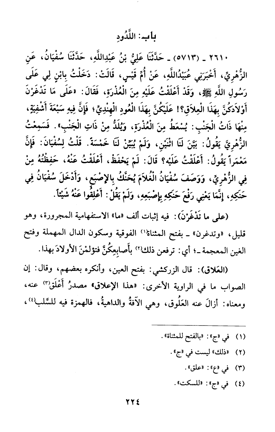 2610 - (5713) - حَدَّثَنَا عَلِيُّ بْنُ عَبْدِ اللَّهِ، حَدَّثَنَا سُفْيَانُ، عَنِ الزُّهْرِيِّ، أَخْبَرَنِي عُبَيْدُ اللَّهِ، عَنْ أُمِّ قَيْسٍ، قَالَتْ: دَخَلْتُ بِابْنٍ لِي عَلَى رَسُولِ اللَّهِ - صلى الله عليه وسلم -، وَقَدْ أَعْلَقْتُ عَلَيْهِ مِنَ الْعُذْرَةِ، فَقَالَ: "عَلَى مَا تَدْغَرْنَ أَوْلاَدَكُنَّ بِهَذَا الْعِلاَقِ؟! عَلَيْكُنَّ بِهَذَا الْعُودِ الْهِنْدِيَّ؛ فَإِنَّ فِيهِ سَبْعَةَ أَشْفِيَةٍ، مِنْهَا ذَاتُ الْجَنْبِ: يُسْعَطُ مِنَ الْعُذْرَةِ، وَيُلَدُّ مِنْ ذَاتِ الْجَنْبِ". فَسَمِعْتُ الزُّهْرِيَّ يَقُولُ: بَيَّنَ لَنَا اثْنَيْنِ، وَلَم يُبَيَّنْ لَنَا خَمْسَةَ. قَلْتُ لِسُفْيَانَ: فَإِنَّ مَعْمَراً يَقُولُ: أَعْلَقْتُ عَلَيْه؟ قَالَ: لَمْ يَحْفَظْ، أَعْلَقْتُ عَنْهُ، حَفِظْتُهُ مِنْ فِي الزُّهْرِيِّ، وَوصفَ سُفْيَانُ الْغُلاَمَ يُحنَّكُ بِالإِصْبَعِ، وَأَدْخَلَ سُفْيَانُ فِي حَنَكِهِ، إِنَّمَا يَعْنِي رَفْعَ حَنَكِهِ بإِصْبَعِهِ، وَلَمْ يَقُلْ: أَعْلِقُوا عَنْهُ شَيْئاً.