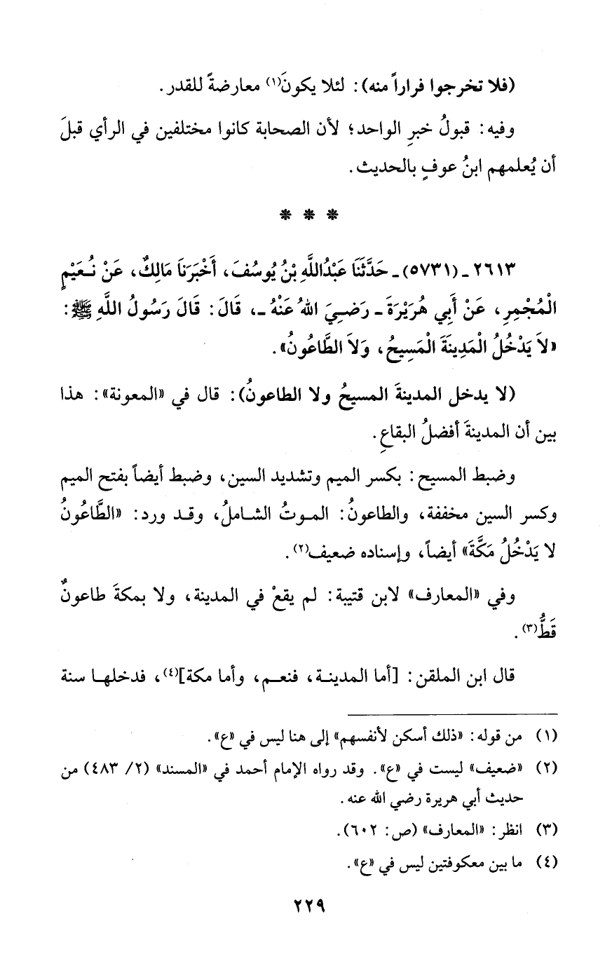 2613 - (5731) - حَدَّثَنَا عَبْدُ اللَّهِ بْنُ يُوسُفَ، أَخْبَرَنَا مَالِكٌ، عَنْ نُعَيْمٍ الْمُجْمِرِ، عَنْ أَبِي هرَيْرَةَ - رَضِيَ اللهُ عَنْهُ -، قَالَ: قَالَ رَسُولُ اللهِ - صلى الله عليه وسلم -: "لاَ يَدْخُلُ الْمَدِينَةَ الْمَسِيحُ، وَلاَ الطَّاعُونُ".