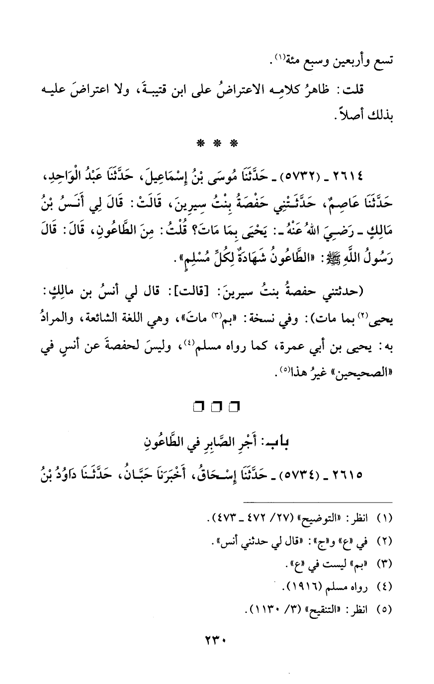 2614 - (5732) - حَدَّثَنَا مُوسَى بْنُ إِسْمَاعِيلَ، حَدَّثَنَا عَبْدُ الْوَاحِدِ، حَدَّثَنَا عَاصِمٌ، حَدَّثَتْنِي حَفْصَةُ بِنْتُ سِيرِينَ، قَالَتْ: قَالَ لِي أَنَسُ بْنُ مَالِكٍ - رَضِيَ اللهُ عَنْهُ -: يَحيىَ بمَا مَاتَ؟ قُلْتُ: مِنَ الطَّاعُونِ، قَالَ: قَالَ رَسُولُ اللَّهِ - صلى الله عليه وسلم -: "الطَّاعُونُ شَهادَةٌ لِكُلِّ مُسْلِمٍ".