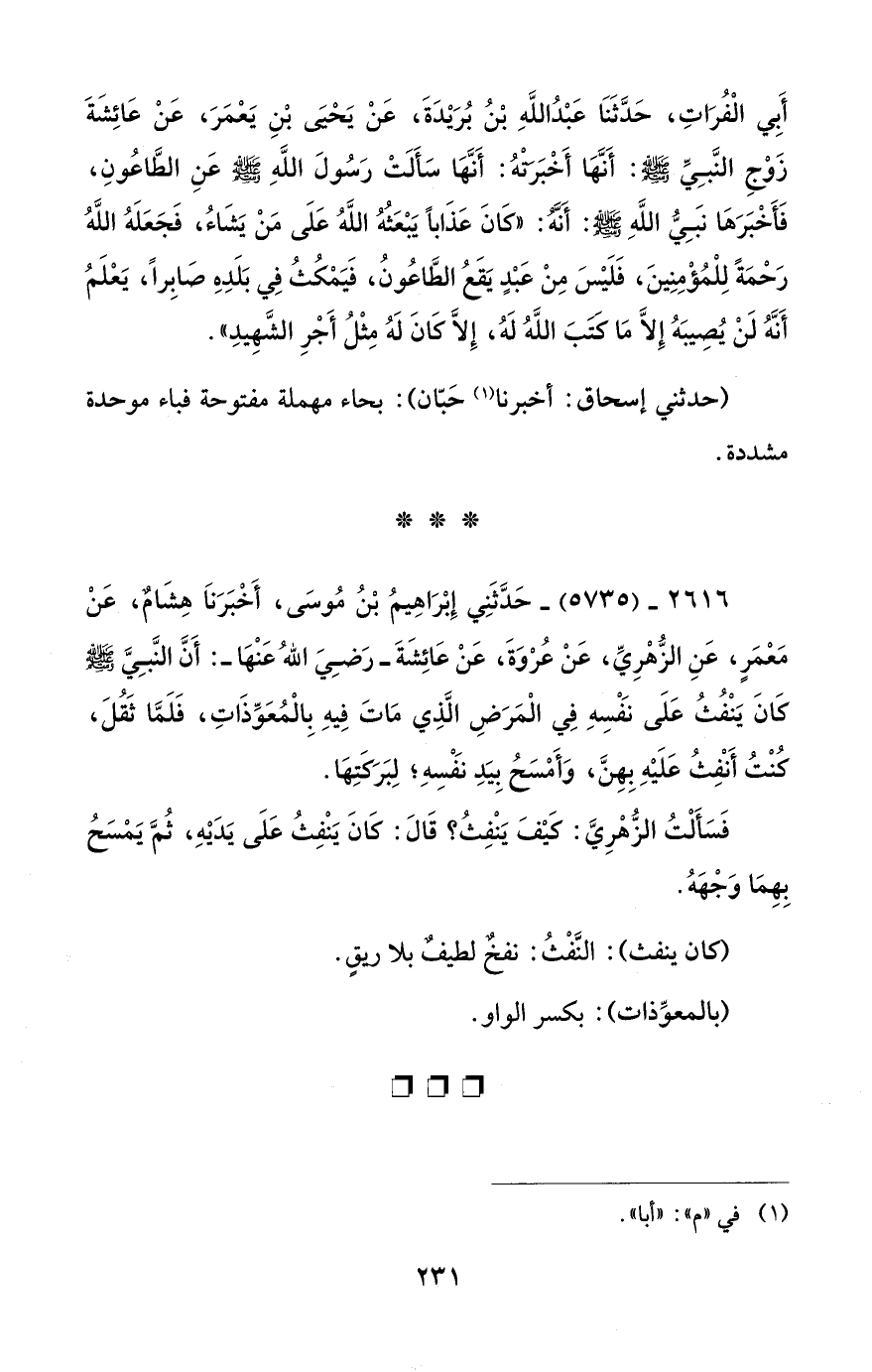 2616 - (5735) - حَدَّثَنِي إِبْرَاهِيمُ بْنُ مُوسَى، أَخْبَرَنَا هِشَامٌ، عَنْ مَعْمَرٍ، عَنِ الزُّهْرِيِّ، عَنْ عُرْوَةَ، عَنْ عَائِشَةَ - رَضِيَ اللهُ عَنْهَا -: أَنَّ النَّبِيَّ - صلى الله عليه وسلم - كَانَ يَنْفُثُ عَلَى نَفْسِهِ فِي الْمَرَضِ الَّذِي مَاتَ فِيهِ بِالْمُعَوِّذَاتِ، فَلَمَّا ثَقُلَ، كُنْتُ أَنْفِثُ عَلَيْهِ بِهِنَّ، وَأَمْسَحُ بِيَدِ نَفْسِهِ؛ لِبَرَكَتِهَا.