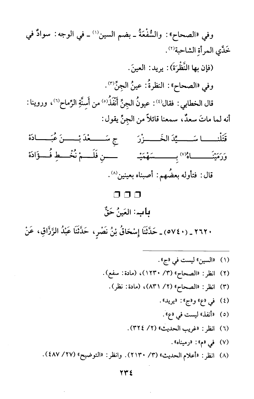 قال الخطابي: فقال (¬4): عيونُ الجِنِّ أَنْفَذُ (¬5) من أَسِنَّةِ الرِّماح (¬6)، وروينا: أنه لما ماتَ سعدٌ، سمعنا قائلاً من الجِنِّ يقول:
