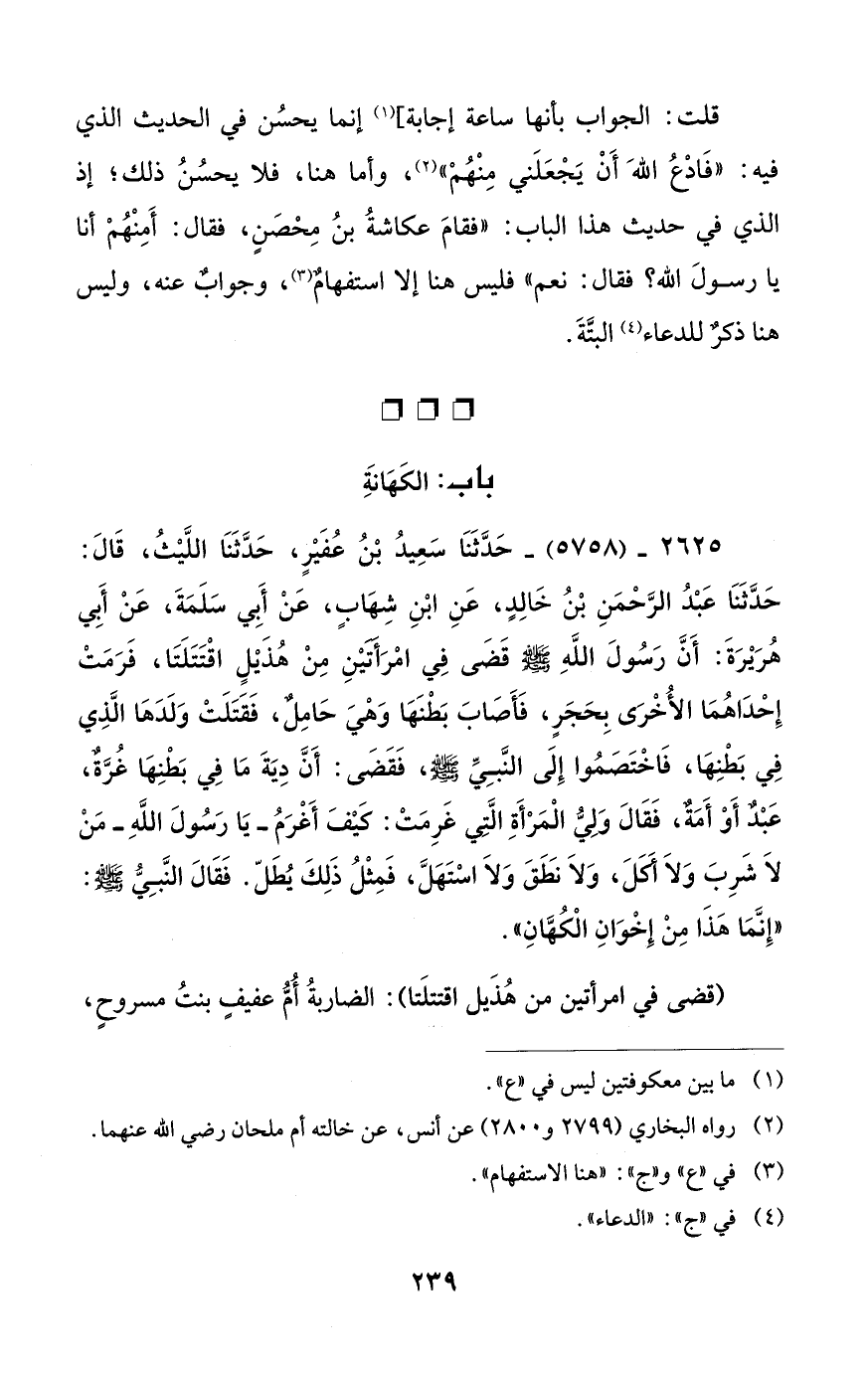 2625 - (5758) - حَدَّثَنَا سَعِيدُ بْنُ عُفَيْرٍ، حَدَّثَنَا اللَّيْثُ، قَالَ: حَدَّثَنَا عَبْدُ الرَّحْمَنِ بْنُ خَالِدٍ، عَنِ ابْنِ شِهَابٍ، عَنْ أِبي سَلَمَةَ، عَنْ أَبِي هُرَيْرَةَ: أَنَّ رَسُولَ اللَّهِ - صلى الله عليه وسلم - قَضَى فِي امرَأَتَيْنِ مِنْ هُذَيْلٍ اقْتَتَلَتَا، فَرَمَتْ إِحْدَاهُمَا الأُخْرَى بِحَجَرٍ، فَأَصَابَ بَطْنَها وَهْيَ حَامِلٌ، فَقَتَلَتْ وَلَدَها الَّذِي فِي بَطْنِها، فَاخْتَصَمُوا إِلَى النَّبِيِّ - صلى الله عليه وسلم -، فَقَضَى: أَنَّ دِيَةَ مَا فِي بَطْنِها غُرَّةٌ، عَبْدٌ أَوْ أَمَةٌ"، فَقَالَ وَلِيُّ الْمَرْأَةِ الَّتِي غَرِمَتْ: كَيْفَ أَغْرَمُ - يَا رَسُولَ اللَّهِ - مَنْ لاَ شَرِبَ وَلاَ أَكَلَ، وَلاَ نَطَقَ وَلاَ اسْتَهَلَّ، فَمِثْلُ ذَلِكَ يُطَلّ. فَقَالَ النَّبِيُّ - صلى الله عليه وسلم -: "إِنَّمَا هذَا مِنْ إِخْوَانِ الْكُهَّانِ".