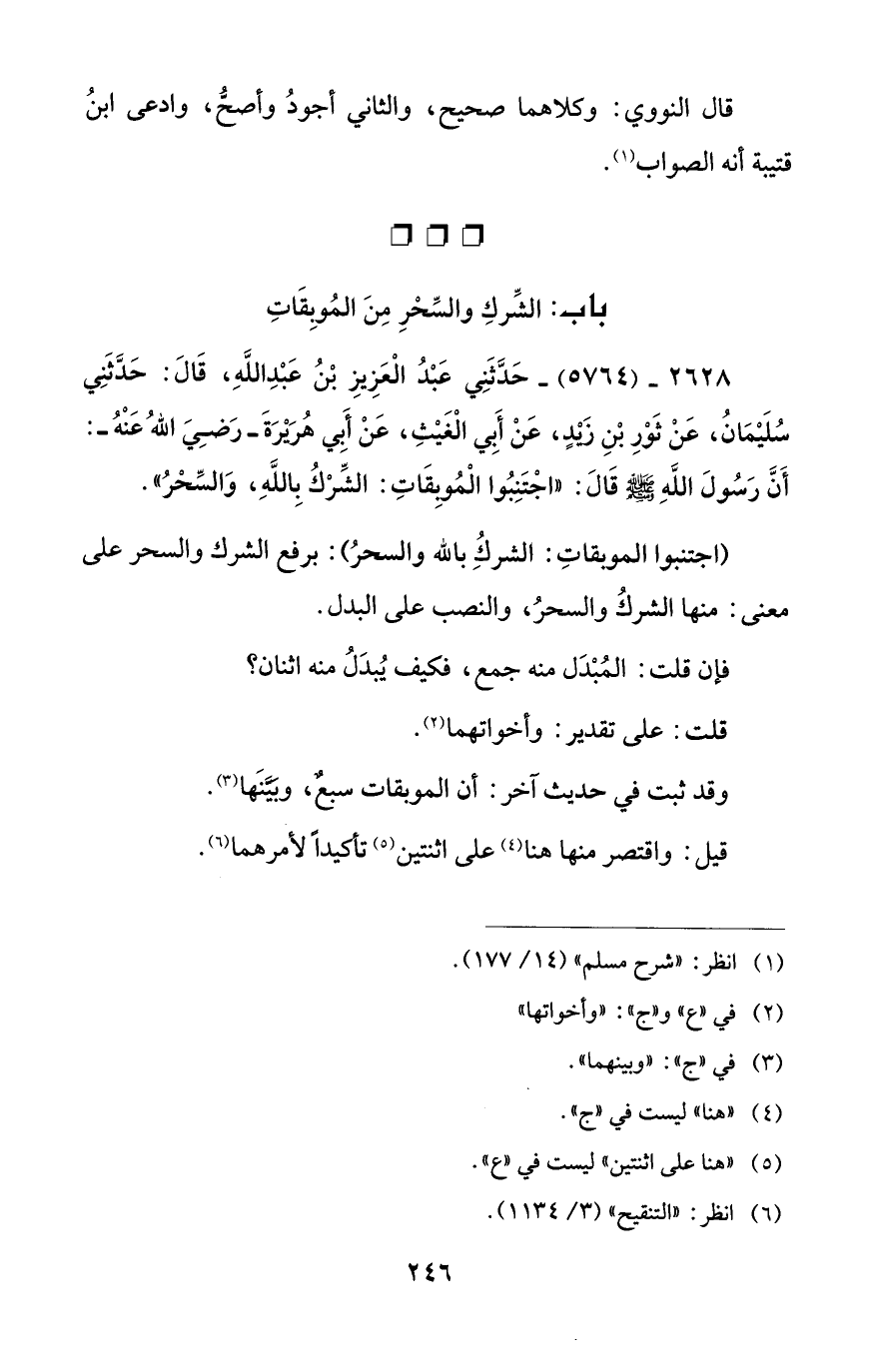 2628 - (5764) - حَدَّثَنِي عَبْدُ الْعَزِيزِ بْنُ عَبْدِ اللَّهِ، قَالَ: حَدَّثَنِي سُلَيْمَانُ، عَنْ ثَوْرِ بْنِ زيدٍ، عَنْ أَبي الْغَيْثِ، عَنْ أَبي هُرَيْرَةَ - رَضِيَ اللهُ عَنْهُ -: أَنَّ رَسُولَ اللَّهِ - صلى الله عليه وسلم - قَالَ: "اجْتَنِبُوا الْمُوبِقَاتِ: الشِّرْكُ بِاللَّهِ، وَالسِّحْرُ".