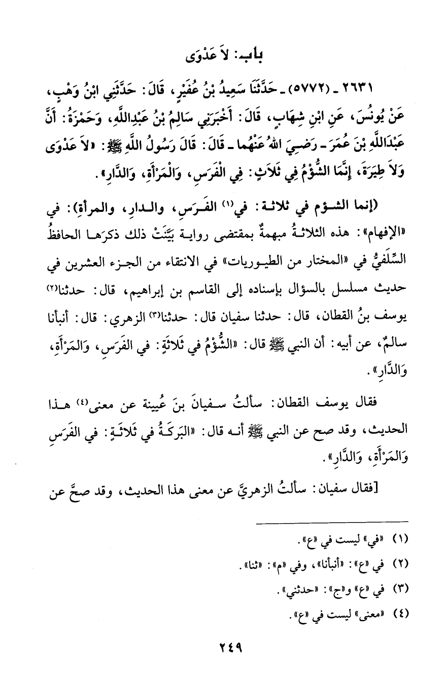 2631 - (5772) - حَدَّثَنَا سَعِيدُ بْنُ عُفَيْرٍ، قَالَ: حَدَّثَنِي ابْنُ وَهْبٍ، عَنْ يُونُسَ، عَنِ ابْنِ شِهَابٍ، قَالَ: أَخْبَرَنِي سَالِمُ بْنُ عَبْدِ اللَّهِ، وَحَمْزَةُ: أَنَّ عَبْدَ اللهِ بْنَ عُمَرَ - رَضِيَ اللهُ عَنْهُما - قَالَ: قَالَ رَسُولُ اللَّهِ - صلى الله عليه وسلم -: "لاَ عَدْوَى وَلاَ طِيَرَةَ، إِنَّمَا الشُّؤْمُ فِي ثَلاَثٍ: فِي الْفَرَسِ، وَالْمَرْأَةِ، وَالدَّارِ".
