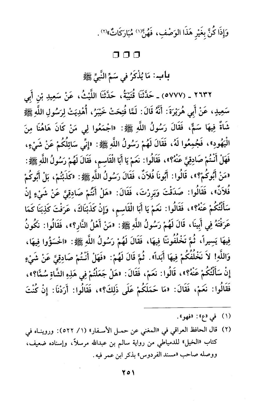 2632 - (5777) - حَدَّثَنَا قُتَيْبَةُ، حَدَّثَنَا اللَّيْثُ، عَنْ سَعِيدِ بْنِ أَبي سَعِيدٍ، عَنْ أَبي هُرَيْرَةَ: أَنَّهُ قَالَ: لَمَّا فُتِحَتْ خَيْبَرُ، أُهْدِيَتْ لِرَسُولِ اللَّهِ - صلى الله عليه وسلم - شَاةٌ فِيها سَمٌّ، فَقَالَ رَسُولُ اللَّهِ - صلى الله عليه وسلم -: "اجْمَعُوا لِي مَنْ كَانَ هَا هُنَا مِنَ الْيَهُودِ"، فَجُمِعُوا لَهُ، فَقَالَ لَهُمْ رَسُولُ اللَّهِ - صلى الله عليه وسلم -: "إِنَّي سَائِلُكُمْ عَنْ شَيْءٍ، فَهَلْ أَنْتُمْ صَادِقِيَّ عَنْهُ؟ "، فَقَالُوا: نَعَمْ يَا أَبَا الْقَاسِمِ، فَقَالَ لَهُمْ رَسُولُ اللَّهِ - صلى الله عليه وسلم -: "مَنْ أَبُوكُمْ؟ "، قَالُوا: أَبُونَا فُلاَنٌ، فَقَالَ رَسُولُ اللَّهِ - صلى الله عليه وسلم -: "كَذَبْتُمْ، بَلْ أَبُوكُمْ فُلاَنٌ"، فَقَالُوا: صَدَقْتَ وَبَرِزْتَ، فَقَالَ: "هلْ أَنْتُمْ صَادِقِيَّ عَنْ شَيْءٍ إِنْ سَأَلْتُكُمْ عَنْهُ؟ "، فَقَالُوا: نَعَمْ يَا أَبَا الْقَاسِمِ، وَإِنْ كَذَبْنَاكَ، عَرَفْتَ كَذِبَنَا كَمَا عَرَفْتَهُ فِي أبَينَا، قَالَ لَهُم رَسُولُ اللَّهِ - صلى الله عليه وسلم -: "مَنْ أَهْلُ النَّارِ؟ "، فَقَالُوا: نَكُونُ فِيهَا يَسِيراً، ثُمَّ تَخْلُفُونَنَا فِيها، فَقَالَ لَهُم رَسُولُ اللَّهِ - صلى الله عليه وسلم -: "اخْسَؤُوا فِيهَا، وَاللهِ! لاَ نخلُفُكُم فِيها أَبَداً". ثُمَّ قَالَ لَهُم: "فَهلْ أَنْتُم صَادِقِيَّ عَنْ شَيْءٍ إِنْ سَأَلْتُكُمْ عَنْهُ؟ "، قَالُوا: نَعَم، فَقَالَ: "هلْ جَعَلْتُم فِي هذِهِ الشَّاةِ سُمًّا؟ "، فَقَالُوا: نَعَمْ، فَقَالَ: "مَا حَمَلَكُمْ عَلَى ذَلِكَ؟ "، فَقَالُوا: أَرَدْنَا: إِنْ كُنْتَ