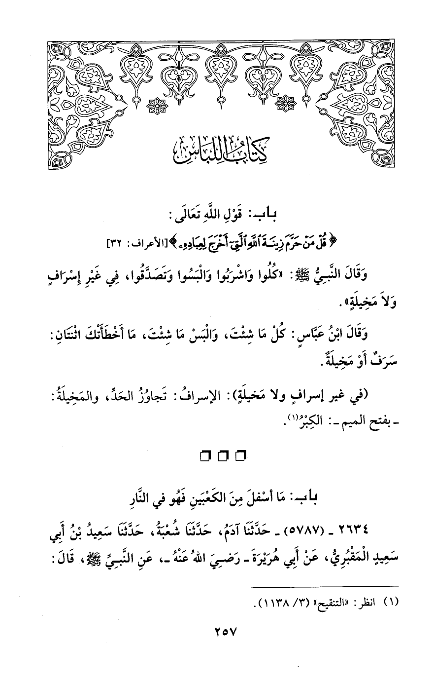 باب: قَوْلِ اللَّهِ تَعَالَى: {قُلْ مَنْ حَرَّمَ زِينَةَ اللَّهِ الَّتِي أَخْرَجَ لِعِبَادِهِ} [الأعراف: 32]