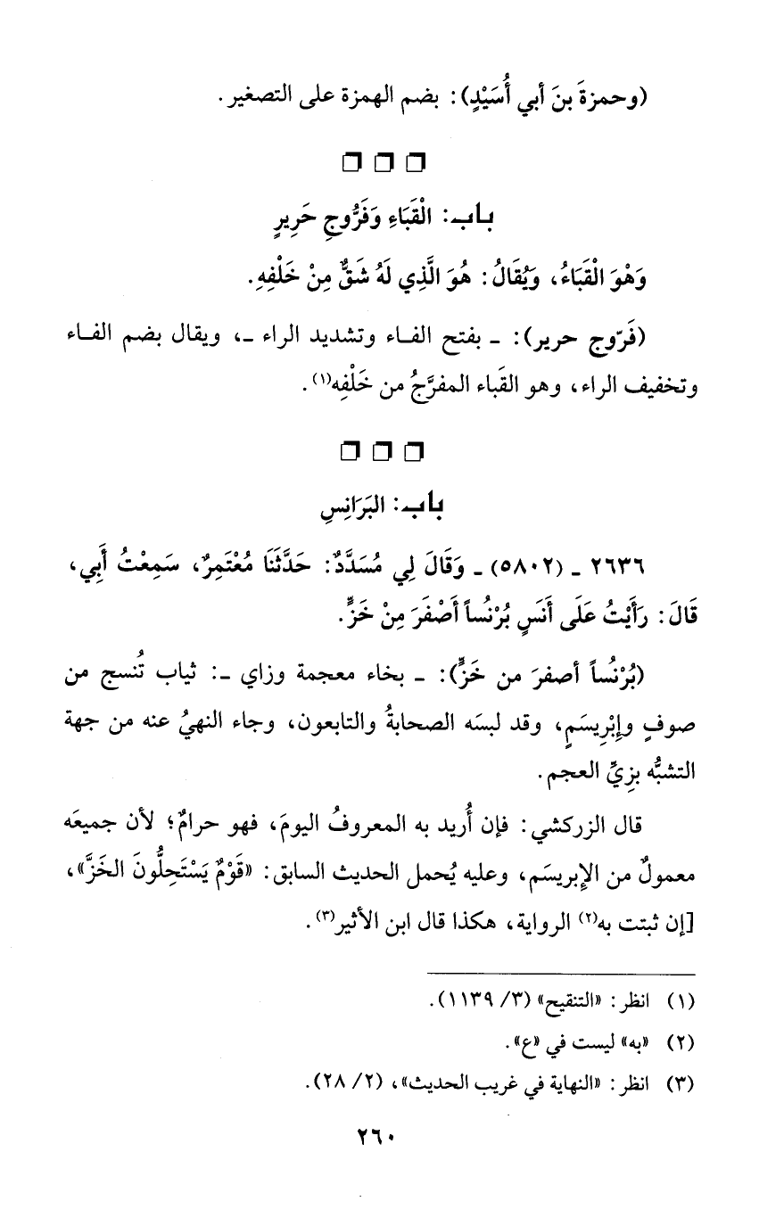 2636 - (5802) - وَقَالَ لِي مُسَدَّدٌ: حَدَّثَنَا مُعتَمِرٌ، سَمِعْتُ أَبِي، قَالَ: رَأَيْتُ عَلَى أَنَسٍ بُرْنُساً أَصْفَرَ مِنْ خَزًّ.