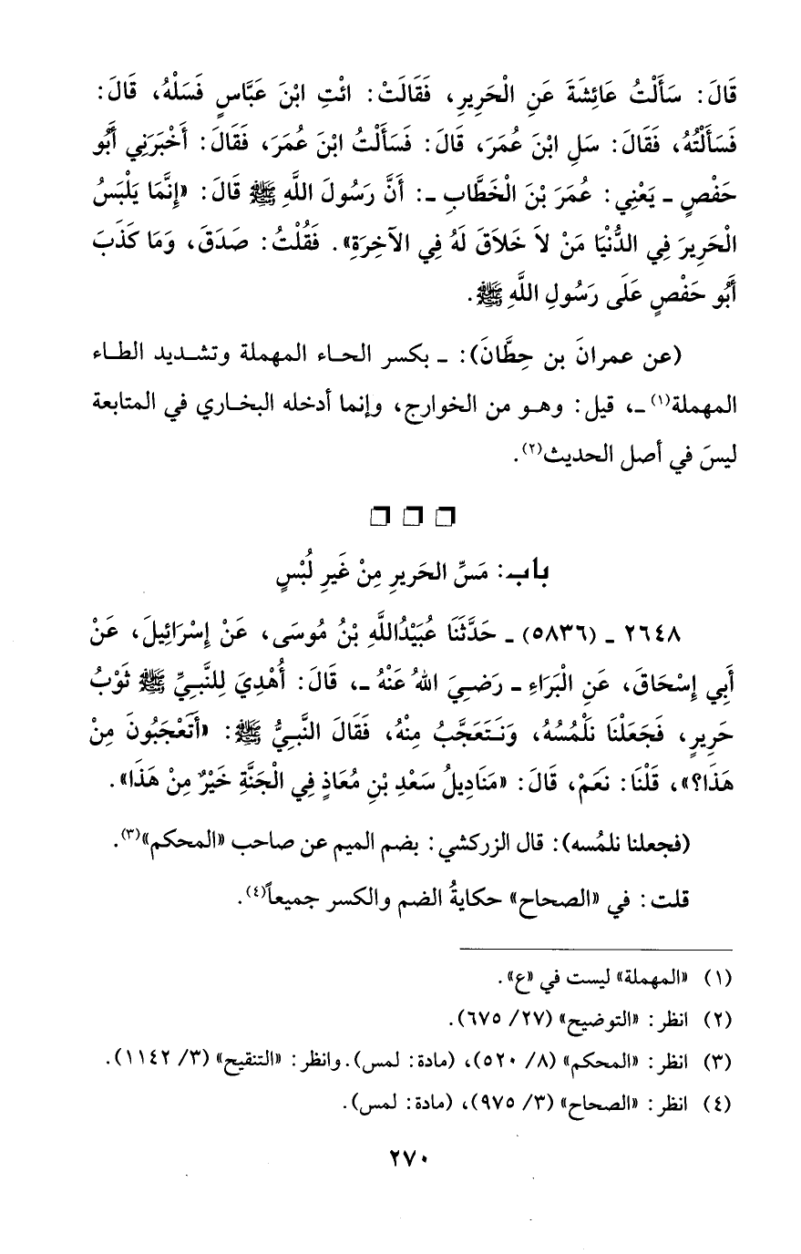 باب: مَسِّ الحَريرِ مِنْ غَيرِ لُبْسٍ