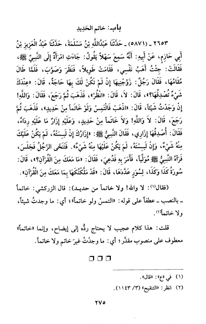 2653 - (5871) - حَدَّثَنَا عَبْدُ اللَّهِ بْنُ مَسْلَمَةَ، حَدَّثَنَا عَبْدُ الْعَزِيزِ بْنُ أَبِي حَازِمٍ، عَنْ أَبِيهِ: أَنَّهُ سَمِعَ سَهْلاً يَقُولُ: جَاءَتِ امْرَأَةٌ إِلَى النَّبِيَّ - صلى الله عليه وسلم -، فَقَالَتْ: جِئْتُ أَهَبُ نَفْسِي، فَقَامَتْ طَوِيلاً، فَنَظَرَ وَصَوَّبَ، فَلَمَّا طَالَ مُقَامُها، فَقَالَ رَجُلٌ: زَوِّجْنِيهَا إِنْ لَمْ تَكُنْ لَكَ بِها حَاجَةٌ، قَالَ: "عِنْدَكَ شَيْءٌ تُصْدِقُهَا؟ "، قَالَ: لاَ، قَالَ: "انْظُرْ"، فَذَهبَ ثُمَّ رَجَعَ، فَقَالَ: وَاللَّهِ! إِنْ وَجدتُ شَيْئاً، قَالَ: "اذْهبْ فَالْتَمِسْ وَلَوْ خَاتَماً مِنْ حَدِيدٍ"، فَذَهَبَ ثُمَّ رَجَعَ، قَالَ: لاَ وَاللَّهِ! وَلاَ خَاتَماً مِنْ حَدِيدٍ، وَعَلَيْهِ إِزَارٌ مَا عَلَيْهِ رِداءٌ، فَقَالَ: أُصْدِقُهَا إِزَارِي، فَقَالَ النَّبِيُّ - صلى الله عليه وسلم -: "إِزَارُكَ إِنْ لَبِسَتْهُ، لَمْ يَكُنْ عَلَيْكَ مِنْهُ شَيْءٌ، وَإِنْ لَبِسْتَهُ، لَمَ يَكُنْ عَلَيْها مِنْهُ شَيْءٌ". فَتَنَحَّى الرَّجُلُ فَجَلَسَ، فَرَآهُ النَّبِيُّ - صلى الله عليه وسلم - مُوَلِّياً، فَأَمَرَ بِهِ فَدُعِيَ، فَقَالَ: "مَا مَعَكَ مِنَ الْقُرآنِ؟ "، قَالَ: سُورَةُ كَذَا وَكَذَا، لِسُوَرٍ عَدَّدَها، قَالَ: "قَدْ مَلَّكْتُكَهَا بِمَا مَعَكَ مِنَ الْقُرْآنِ".