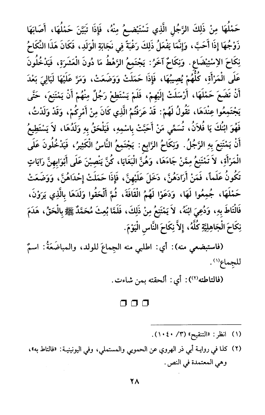 حَمْلُهَا مِنْ ذَلِكَ الرَّجُلِ الَّذِي تَسْتَبْضعُ مِنْهُ، فَإِذَا تَبَيَّنَ حَمْلُهَا، أَصَابَهَا زَوْجُهَا اذَا أَحَبَّ، وَإِنَّمَا يَفْعَلُ ذَلِكَ رَغْبَةً فِي نَجَابَةِ الْوَلَدِ، فَكَانَ هَذَا النِّكاحُ نِكَاحَ الاسْتِبْضَاعِ. وَنِكَاحٌ آخَرُ: يَجْتَمِعُ الرَّهْطُ مَا دُونَ الْعَشَرَةِ، فَيَدْخُلُونَ عَلَى الْمَرْأَةِ، كُلُّهُمْ يُصِيبُهَا، فَإِذَا حَمَلَتْ وَوَضَعَتْ، وَمَرَّ عَلَيْهَا لَيَالِيَ بَعْدَ أَنْ تَضَعَ حَمْلَهَا، أَرْسَلَتْ إِلَيْهِمْ، فَلَمْ يَسْتَطِعْ رَجُل مِنْهُمْ أَنْ يَمْتَنِعَ، حَتَّى يَجْتَمِعُوا عِنْدَهَا، تَقُولُ لَهُمْ: قَدْ عَرَفْتُمُ الَّذِي كَانَ مِنْ أَمْرِكُمْ، وَقَدْ وَلَدْتُ، فَهُوَ ابْنُكَ يَا فُلَانُ، تُسَمِّي مَنْ أَحَبَّتْ بِاسْمِهِ، فَيَلْحَقُ بِهِ وَلَدُهَا، لَا يَسْتَطِيعُ أَنْ يَمْتَنِعَ بِهِ الرَّجُلُ. وَنِكَاحُ الرَّابِعِ: يَجْتَمِعُ النَّاسُ الْكَثِيرُ، فَيَدْخُلُونَ عَلَى الْمَرْأَةِ، لَا تَمْتَنِعُ مِمَّنْ جَاءَهَا، وَهُنَّ الْبَغَايَا، كُنَّ يَنْصِبْنَ عَلَى أَبْوَابِهِنَّ رَايَاتٍ تَكُونُ عَلَمًا، فَمَنْ أَرَادَهُنَّ، دَخَلَ عَلَيْهِنَّ، فَإِذَا حَمَلَتْ إِحْدَاهُنَّ، وَوَضَعَتْ حَمْلَهَا، جُمِعُوا لَهَا، وَدَعَوْا لَهُمُ الْقَافَةَ، ثُمَّ ألحَقُوا وَلَدَهَا بِالَّذِي يَرَوْنَ، فَالْتَاطَ بِهِ، وَدُعِيَ ابْنَهُ، لَا يَمْتَنِعُ مِنْ ذَلِكَ، فَلَمَّا بُعِثَ مُحَمَّدٌ - صلى الله عليه وسلم - بِالْحَقِّ، هَدَمَ نِكَاحَ الْجَاهِلِيَّةِ كُلَّهُ، إِلَّا نِكَاحَ النَّاسِ الْيَوْمَ.