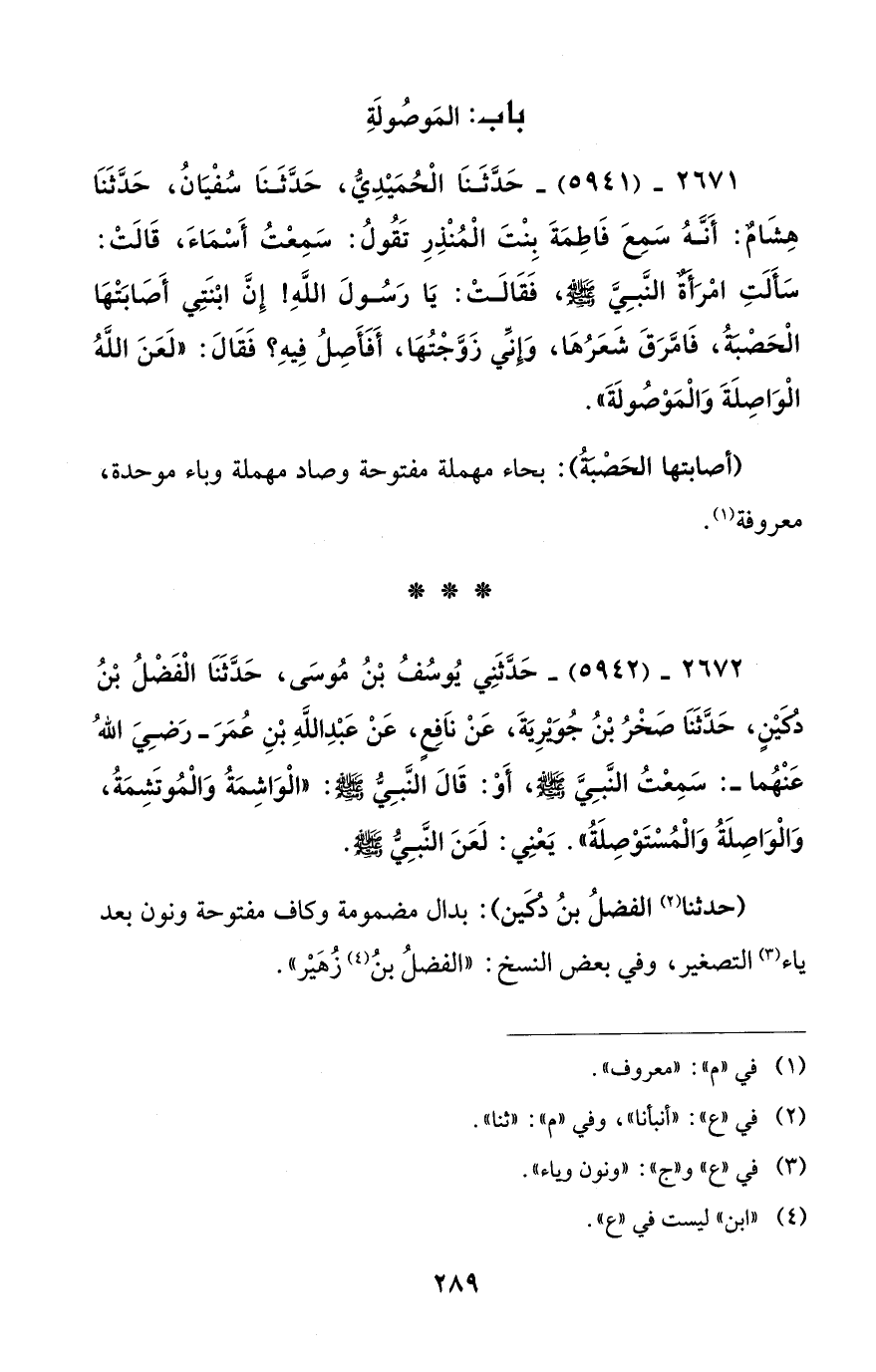 2672 - (5942) - حَدَّثَنِي يُوسُفُ بْنُ مُوسَى، حَدَّثَنَا الْفَضْلُ بْنُ دُكَيْنٍ، حَدَّثَنَا صَخْرُ بْنُ جُوَيْرِيَةَ، عَنْ ناَفِعٍ، عَنْ عَبْدِ اللَّهِ بْنِ عُمَرَ - رَضِيَ اللهُ عَنْهُما -: سَمِعْتُ النَّبِيَّ - صلى الله عليه وسلم -، أَوْ: قَالَ النَّبِيُّ - صلى الله عليه وسلم -: "الْوَاشِمَةُ وَالْمُوتَشِمَةُ، وَالْوَاصِلَةُ وَالْمُسْتَوْصِلَةُ". يَعنِي: لَعَنَ النَّبِيُّ - صلى الله عليه وسلم -.