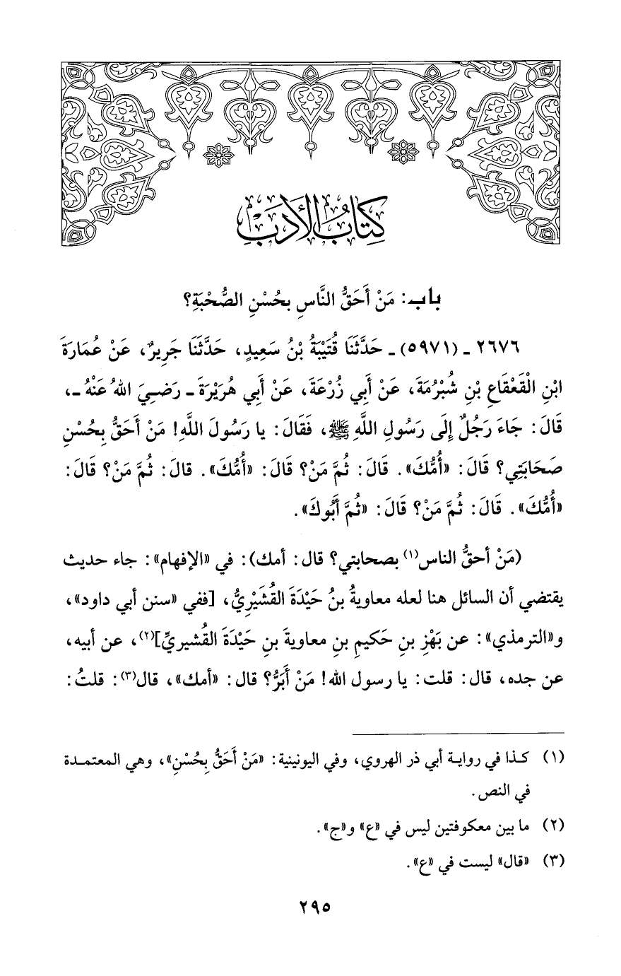 2676 - (5971) - حَدَّثَنَا قُتَيْبَةُ بْنُ سَعِيدٍ، حَدَّثَنَا جَرِيرٌ، عَنْ عُمَارَةَ ابْنِ الْقَعْقَاعِ بْنِ شُبْرُمَةَ، عَنْ أَبِي زُرْعَةَ، عَنْ أَبِي هُرَيْرَةَ - رَضِيَ اللهُ عَنْهُ -، قَالَ: جَاءَ رَجُلٌ إِلَى رَسُولِ اللَّهِ - صلى الله عليه وسلم -، فَقَالَ: يا رَسُولَ اللَّهِ! مَنْ أَحَقُّ بِحُسْنِ صَحَابَتِي؟ قَالَ: "أُمُّكَ". قَالَ: ثُمَّ مَنْ؟ قَالَ: "أُمُّكَ". قالَ: ثُمَّ مَنْ؟ قَالَ: "أُمُّك". قَالَ: ثُمَّ مَن؟ قَالَ: "ثُمَّ أَبُوكَ".