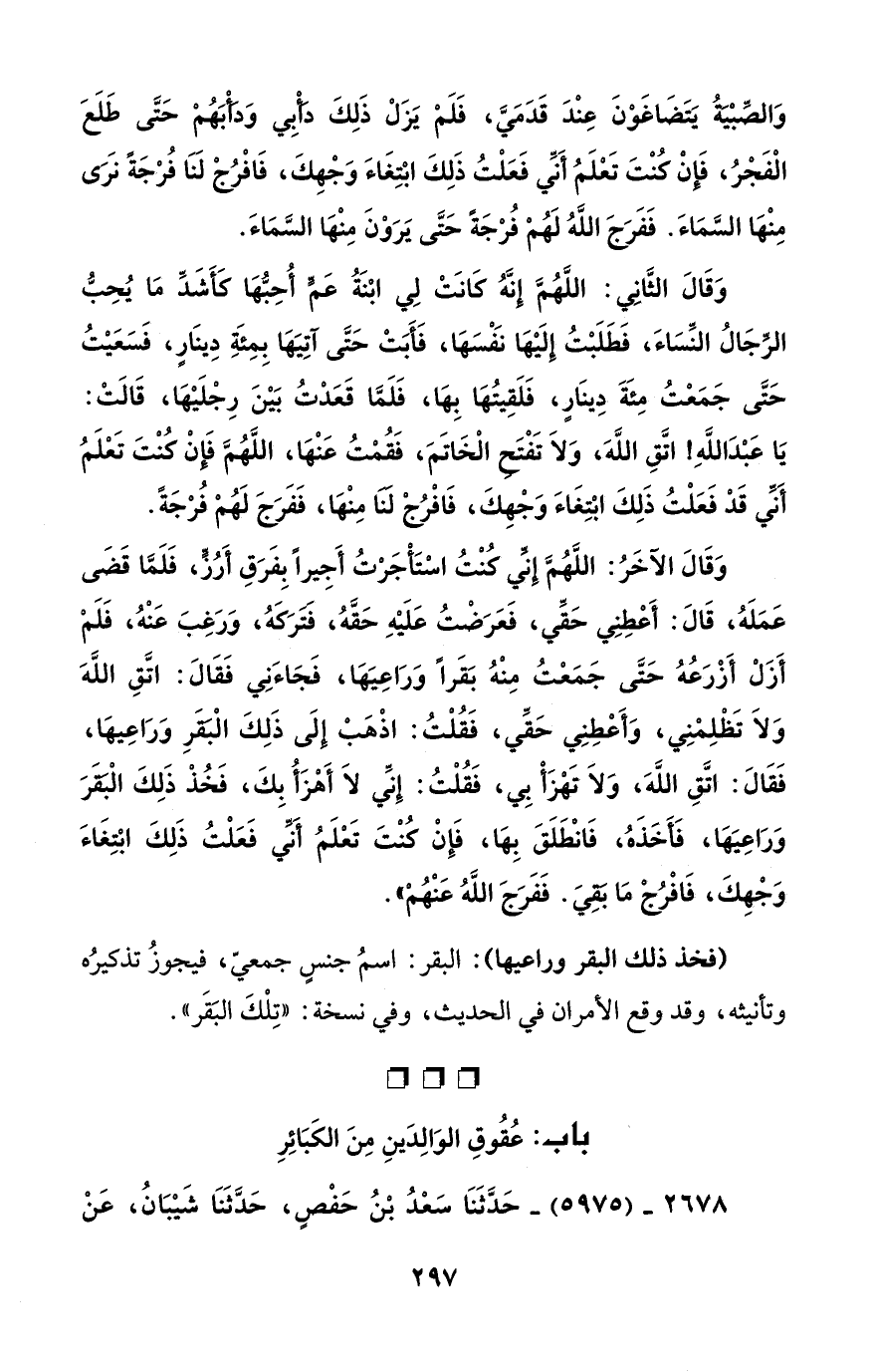 وَقَالَ الآخَرُ: اللَّهُمَّ إِنَّي كُنْتُ استَأجَرْتُ أَجِيراً بِفَرَقِ أَرُزًّ، فَلَمَّا قَضَى عَمَلَهُ، قَالَ: أَعطِنِي حَقِّي، فَعَرَضْتُ عَلَيْهِ حَقَّهُ، فترَكَهُ، وَرَغِبَ عَنْهُ، فَلَمْ أَزَلْ أَزْرَعُهُ حَتَّى جَمعتُ مِنْهُ بَقَراً وَرَاعِيها، فَجَاءَنِي فَقَالَ: اتَّقِ اللَّهَ وَلاَ تَظْلِمْنِي، وَأَعطِنِي حَقِّي، فَقُلْتُ: اذْهبْ إلَى ذَلِكَ الْبَقَرِ وَرَاعِيهَا، فَقَالَ: اتقِ اللَّهَ، وَلاَ تَهْزَأْ بِي، فَقُلْتُ: إِنَّي لاَ أَهْزَأُ بِكَ، فَخُذْ ذَلِكَ الْبَقَرَ وَرَاعِيَهَا، فَأَخذَهُ، فَانْطَلَقَ بِها، فَإِنْ كُنْتَ تَعلَمُ أَنَّي فَعَلْتُ ذَلِكَ ابْتِغَاءَ وَجْهِكَ، فَافْرُجْ مَا بقِيَ. فَفَرَجَ اللَّهُ عَنْهُمْ".