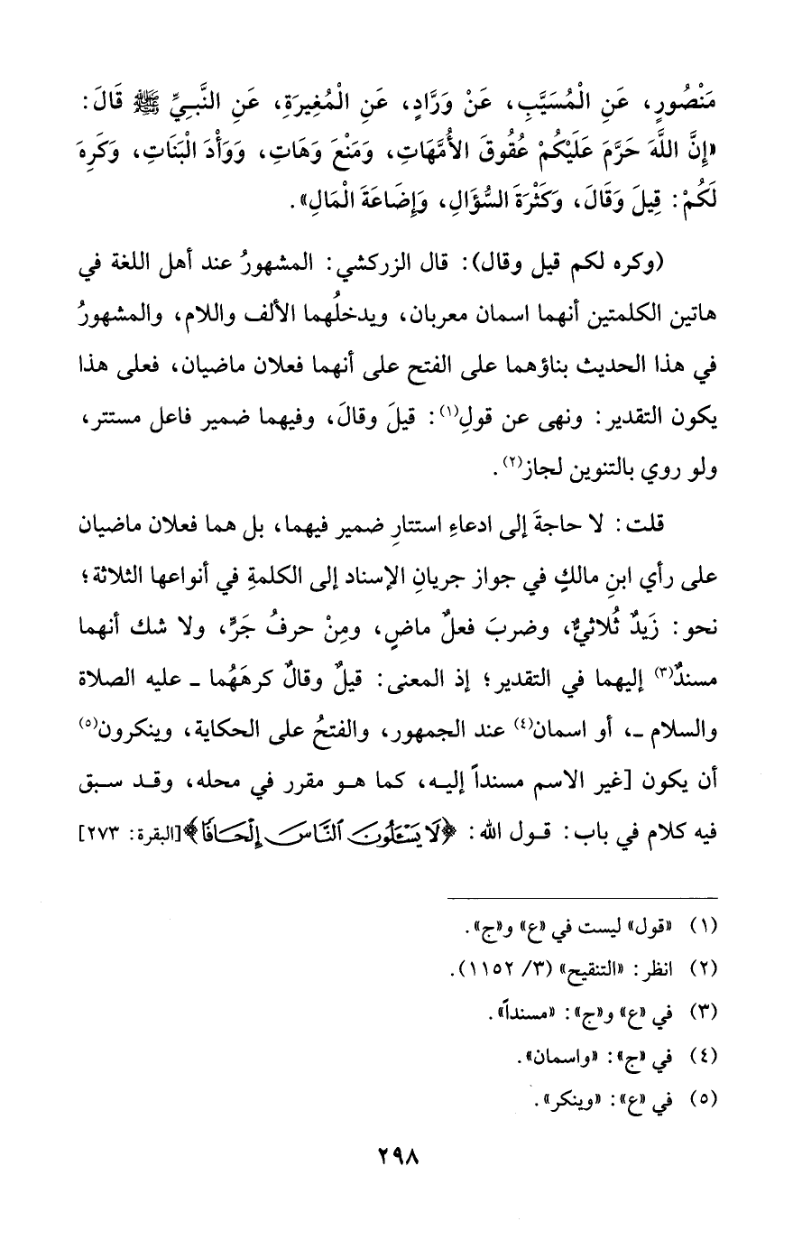 مَنْصُورٍ، عَنِ الْمُسَيَّبِ، عَنْ وَرَّادٍ، عَنِ الْمُغِيرَةِ، عَنِ النَّبِيِّ - صلى الله عليه وسلم - قَالَ: "إِنَّ اللَّهَ حَرَّمَ عَلَيْكُم عُقُوقَ الأُمَّهَاتِ، وَمَنْعَ وَهَاتِ، وَوَأْدَ الْبَنَاتِ، وَكَرِهَ لَكُمْ: قِيلَ وَقَالَ، وَكثْرَةَ السُّؤَالِ، وَإِضَاعَةَ الْمَالِ".