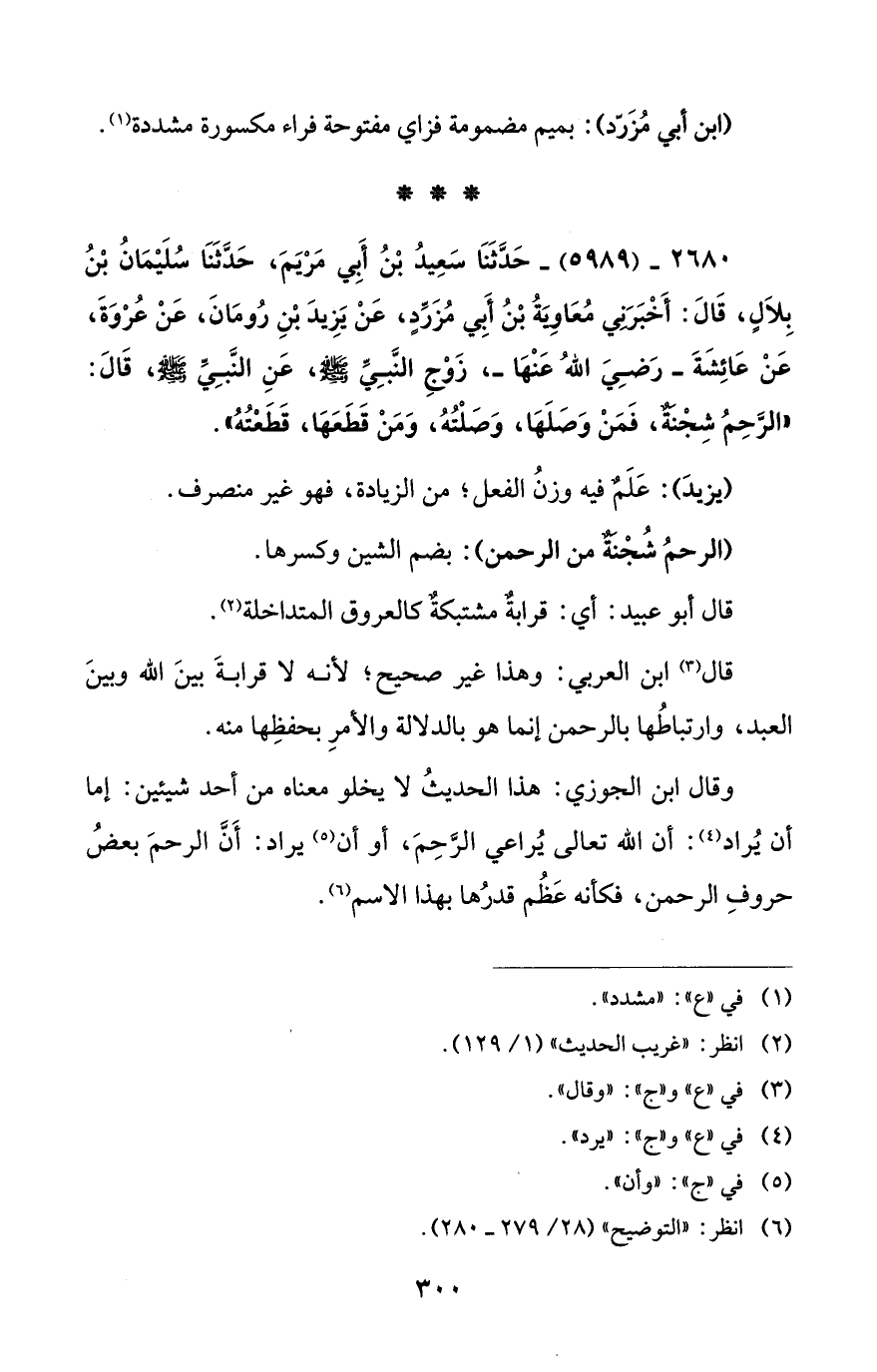 2680 - (5989) - حَدَّثَنَا سَعِيدُ بْنُ أَبِي مَرْيَمَ، حَدَّثَنَا سُلَيْمَانُ بْنُ بِلاَلٍ، قَالَ: أَخْبَرَنِي مُعَاوِيَةُ بْنُ أَبِي مُزَرِّدٍ، عَنْ يَزِيدَ بْنِ رُومَانَ، عَنْ عُروَةَ، عَنْ عَائِشَةَ - رَضِيَ اللهُ عَنْهَا -، زَوْجِ النَّبِيِّ - صلى الله عليه وسلم -، عَنِ النَّبِيَّ - صلى الله عليه وسلم -، قَالَ: "الرَّحِمُ شِجْنَةٌ، فَمَنْ وَصَلَهَا، وَصَلْتُهُ، وَمَنْ قَطَعَها، قَطَعْتُهُ".