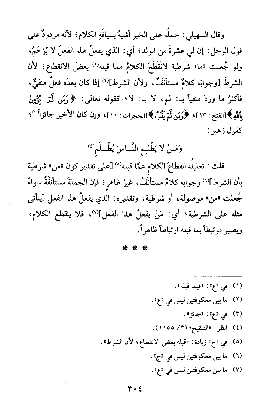 وقال السهيلي: حملُه على الخبر أشبهُ بسياقَةِ الكلام؛ لأنه مردودٌ على قول الرجل: إن لي عشرةً من الولد؛ أي: الذي يفعلُ هذا الفعلَ لا يُرْحَمُ، ولو جُعلت "ما" شرطية لانْقَطَعَ الكلامُ مما قبله (¬1) بعضَ الانقطاع؛ لأن الشرطَ [وجوابَه كلامٌ مستأنَفٌ، ولأن الشرط] (¬2) إذا كان بعدَه فعلٌ منفيٌّ، فأكثرُ ما وردَ منفياً بـ: لم، لا بـ: لا؛ كقوله تعالى: {وَمَنْ لَمْ يُؤْمِنْ بِاللَّهِ} [الفتح: 13]، {وَمَنْ لَمْ يَتُبْ} [الحجرات: 11]، وإن كان الأخير جائزاً (¬3)؛ كقول زهير: