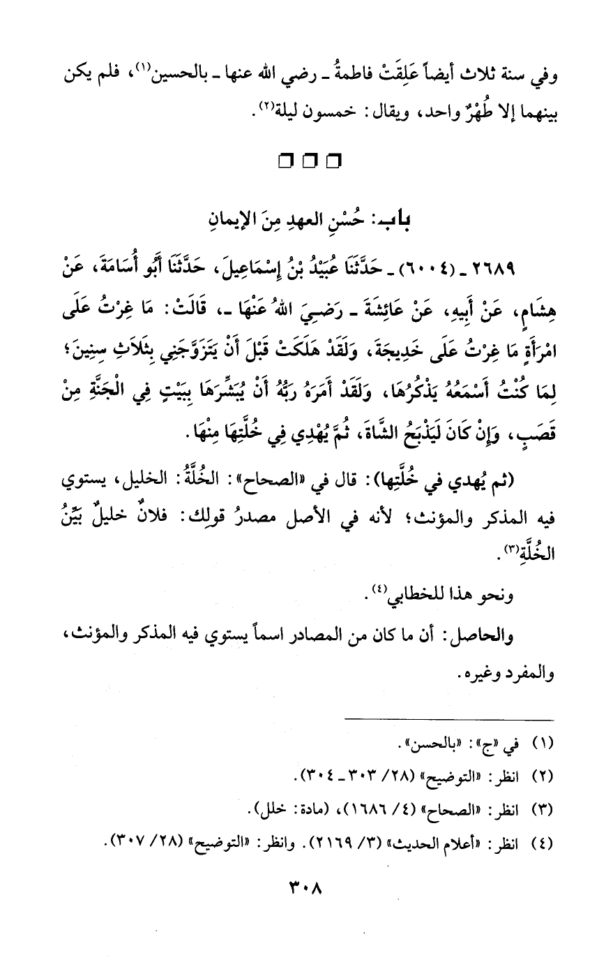 2689 - (6004) - حَدَّثَنَا عُبَيْدُ بْنُ إِسْمَاعِيلَ، حَدَّثَنَا أَبو أُسَامَةَ، عَنْ هِشَامٍ، عَنْ أَبِيهِ، عَنْ عَائِشَةَ - رَضِيَ اللهُ عَنْهَا -، قَالَتْ: مَا غِرْتُ عَلَى امْرَأَةٍ مَا غِرْتُ عَلَى خَدِيجَةَ، وَلَقَد هلَكَتْ قَبْلَ أَنْ يتَزَوَّجَنِي بِثَلاَثِ سِنِينَ؛ لِمَا كُنْتُ أَسْمَعُهُ يَذْكُرُهَا، وَلَقَدْ أَمَرَهُ رَبُّهُ أَنْ يُبَشِّرَهَا بِبَيْتٍ فِي الْجَنَّةِ مِنْ قَصَبٍ، وَإِنْ كَانَ لَيَذْبَحُ الشَّاةَ، ثُمَّ يُهْدِي فِي خُلَّتِهَا مِنْهَا.