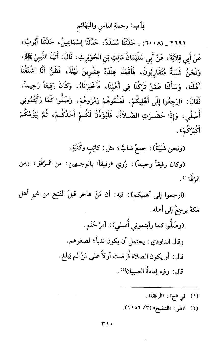2691 - (6008) - حَدَّثَنَا مُسَدَّدٌ، حَدَّثَنَا إِسْمَاعِيلُ، حَدَّثَنَا أَيُّوبُ، عَنْ أَبي قِلاَبَةَ، عَنْ أَبِي سُلَيْمَانَ مَالِكِ بْنِ الْحُوَيْرِثِ، قَالَ: أَتَيْنَا النَّبِيَّ - صلى الله عليه وسلم -، وَنَحْنُ شَبَبَةٌ مُتَقَارِبُونَ، فَأَقَمْنَا عِنْدَهُ عِشْرِينَ لَيْلَةً، فَظَنَّ أَنَّا اشْتَقْنَا أَهْلَنَا، وَسَأَلَنَا عَمَّنْ تَرَكْنَا فِي أَهْلِنَا، فَأَخْبَرْنَاهُ، وَكَانَ رَفِيقاً رَحِيماً، فَقَالَ: "اِرجِعُوا إِلَى أَهْلِيكُمْ، فَعَلِّمُوهُمْ وَمُرُوهُمْ، وَصَلُّوا كَمَا رَأَيْتُمُونِي أُصَلِّي، وَإِذَا حَضَرَتِ الصَّلاَةُ، فَلْيُؤَذَّنْ لَكُمْ أَحَدُكُمْ، ثُمَّ لِيَؤُمَّكُمْ أَكْبَرُكُمْ".
