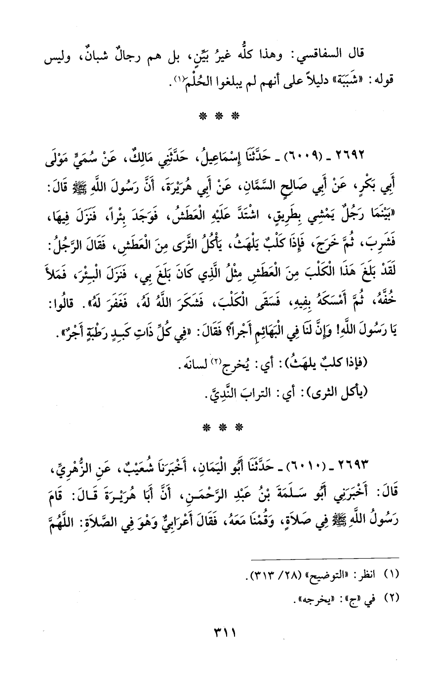 2692 - (6009) - حَدَّثَنَا إِسْمَاعِيلُ، حَدَّثَنِي مَالِكٌ، عَنْ سُمَيِّ مَوْلَى أَبي بَكْرٍ، عَنْ أَبي صَالِحٍ السَّمَّانِ، عَنْ أَبِي هُرَيْرَةَ، أَنَّ رَسُولَ اللَّهِ - صلى الله عليه وسلم - قَالَ: "بَيْنَمَا رَجُلٌ يَمْشِي بِطَرِيقٍ، اشتَدَّ عَلَيْهِ الْعَطَشُ، فَوَجَدَ بِئْراً، فَنَزَلَ فِيهَا، فَشَرِبَ، ثُمَّ خَرَجَ، فَإِذَا كَلْبٌ يَلْهَثُ، يَأْكُلُ الثَّرَى مِنَ الْعَطَشِ، فَقَالَ الرَّجُلُ: لَقَد بَلَغَ هذَا الْكَلْبَ مِنَ الْعَطَشِ مِثْلُ الَّذِي كَانَ بَلَغَ بِي، فَنَزَلَ الْبِئْرَ، فَمَلأَ خُفَّهُ، ثُمَّ أَمسَكَهُ بِفِيهِ، فَسَقَى الْكَلْبَ، فَشَكَرَ اللَّهُ لَهُ، فَغَفَرَ لَهُ". قالُوا: يَا رَسُولَ اللَّهِ! وَإِنَّ لنا فِي الْبَهائِم أَجْراً؟ فَقَالَ: "فِي كُلِّ ذَاتِ كبِدٍ رَطْبَةٍ أَجْرٌ".