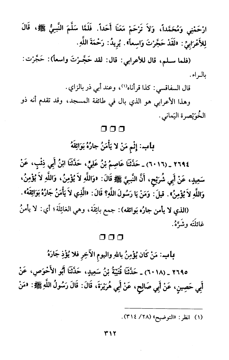 باب: مَنْ كَان يُؤْمِنُ باللهِ واليومِ الآخِرِ فلا يُؤْذِ جَارَهُ