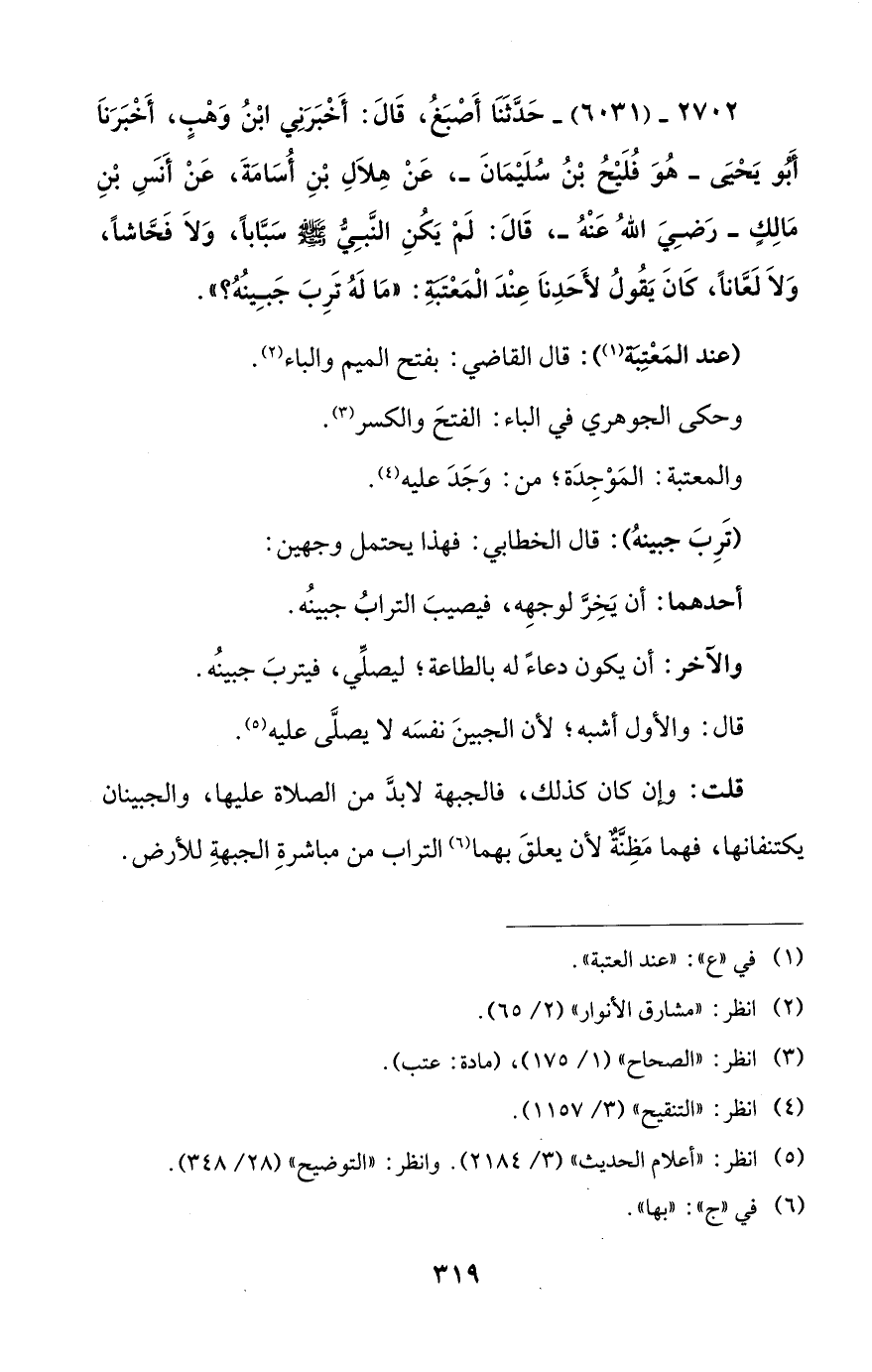 2702 - (6031) - حَدَّثَنَا أَصْبَغُ، قَالَ: أَخْبَرَنِي ابْنُ وَهْبٍ، أَخْبَرَنَا أَبُو يَحْيَى - هُوَ فُلَيْحُ بْنُ سُلَيْمَانَ -، عَنْ هِلاَلِ بْنِ أُسَامَةَ، عَنْ أَنَسِ بْنِ مَالِكٍ - رَضِيَ اللهُ عَنْهُ -، قَالَ: لَمْ يَكُنِ النَّبِيُّ - صلى الله عليه وسلم - سَبَّاباً، وَلاَ فَحَّاشاً، وَلاَ لَعَّاناً، كَانَ يَقُولُ لأَحَدِنَا عِنْدَ الْمَعْتَبَةِ: "مَا لَهُ تَرِبَ جَبِينُهُ؟ ".