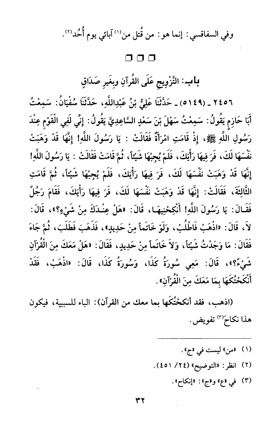 2456 - (5149) - حَدَّثَنَا عَلِيُّ بْنُ عَبْدِ اللهِ، حَدَّثَنَا سُفْيَانُ: سَمِعْتُ أَبَا حَازِمٍ يَقُولُ: سَمِعْتُ سَهْلَ بْنَ سَعْدٍ السَّاعِدِيَّ يَقُولُ: إِنِّي لَفِي الْقَوْمِ عِنْدَ رَسُولِ اللهِ - صلى الله عليه وسلم -، إِذْ قَامَتِ امْرَأة فَقَالَتْ: يَا رَسُولَ اللهِ! إِنَّهَا قَدْ وَهَبَتْ نَفْسَهَا لَكَ، فَرَ فِيهَا رَأْيَكَ، فَلَمْ يُجِبْهَا شَيْئًا، ثُمَّ قَامَتْ فَقَالَتْ: يَا رَسُولَ اللهِ! إِنَّهَا قَدْ وَهَبَتْ نفسَهَا لَكَ، فَرَ فِيهَا رَأْيَكَ، فَلَمْ يُجبْهَا شَيْئًا، ثُمَّ قَامَتِ الثَّالِثَةَ، فَقَالَتْ: إِنَّهَا قَدْ وَهَبَتْ نَفْسَهَا لَكَ، فَرَ فِيهَا رَأْيَكَ، فَقَامَ رَجُلٌ فَقَالَ: يَا رَسُولَ اللهِ! أَنْكِحْنِيهَا، قَالَ: "هَلْ عِنْدَكَ مِنْ شَيْءٍ؟ "، قَالَ: لَا، قَالَ: "اذْهَبْ فَاطْلُبْ، وَلَوْ خَاتَمًا مِنْ حَدِيدٍ"، فَذَهَبَ فَطَلَبَ، ثُمَّ جَاءَ فَقَالَ: مَا وَجَدْتُ شَيْئًا، وَلَا خَاتَمًا مِنْ حَدِيدٍ، فَقَالَ: "هَلْ مَعَكَ مِنَ الْقُرْآنِ شَيْءٌ؟ "، قَالَ: مَعِي سُورَةُ كَذَا، وَسُورَةُ كَذَا، قَالَ: "اذْهَبْ، فَقَدْ أَنْكَحْتُكَهَا بِمَا مَعَكَ مِنَ الْقُرْآنِ".