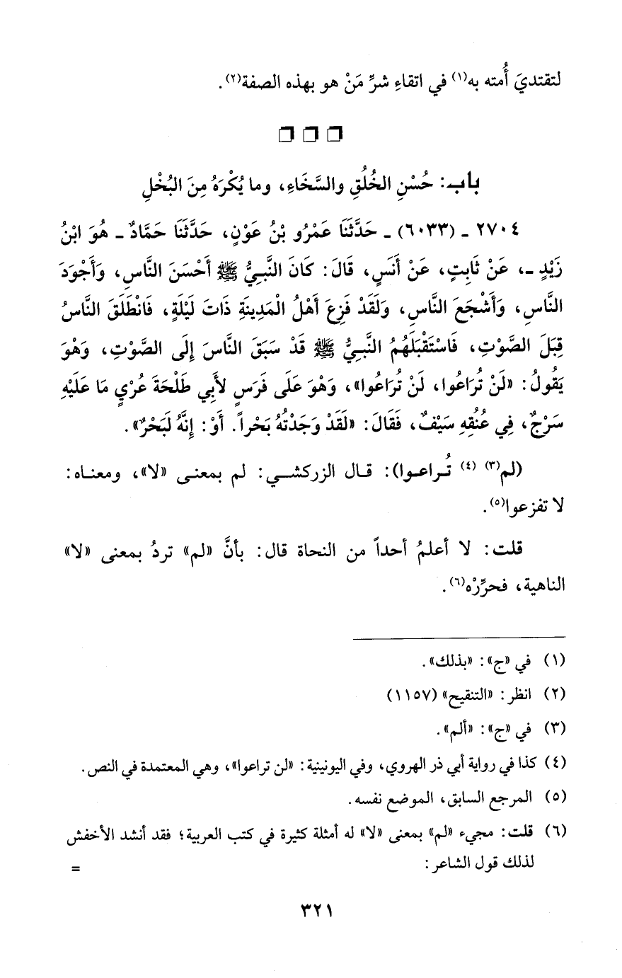 2704 - (6033) - حَدَّثَنَا عَمْرُو بْنُ عَوْنٍ، حَدَّثَنَا حَمَّادٌ - هُوَ ابْنُ زَيْدٍ -، عَنْ ثَابِتٍ، عَنْ أَنَسٍ، قَالَ: كَانَ النَّبِيُّ - صلى الله عليه وسلم - أَحْسَنَ النَّاسِ، وَأَجْوَدَ النَّاسِ، وَأَشْجَعَ النَّاسِ، وَلَقَدْ فَزِعَ أَهْلُ الْمَدِينَةِ ذَاتَ لَيْلَةٍ، فَانْطَلَقَ النَّاسُ قِبَلَ الصَّوْتِ، فَاسْتَقْبَلَهُمُ النَّبِيُّ - صلى الله عليه وسلم - قَدْ سَبَقَ النَّاسَ إِلَى الصَّوْتِ، وَهْوَ يَقُولُ: "لَنْ تُرَاعُوا، لَنْ تُرَاعُوا"، وَهْوَ عَلَى فَرَسٍ لأَبِي طَلْحَةَ عُرْيٍ مَا عَلَيْهِ سَرْجٌ، فِي عُنُقِهِ سَيْفٌ، فَقَالَ: "لَقد وَجدتُهُ بَحْراً. أَوْ: إِنَّهُ لَبَحْرٌ".