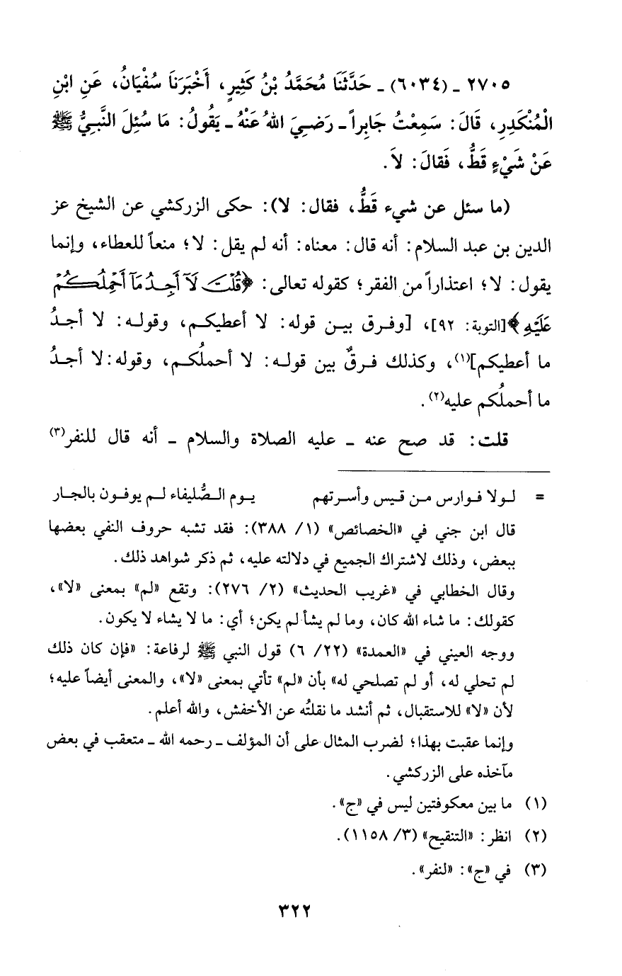 2705 - (6034) - حَدَّثَنَا مُحَمَّدُ بْنُ كَثِيرٍ، أَخْبَرَنَا سُفْيَانُ، عَنِ ابْنِ الْمُنْكَدِرِ، قَالَ: سَمِعْتُ جَابِراً - رَضِيَ اللهُ عَنْهُ - يَقُولُ: مَا سُئِلَ النَّبِيُّ - صلى الله عليه وسلم - عَنْ شَيْءٍ قَطُّ، فَقالَ: لاَ.