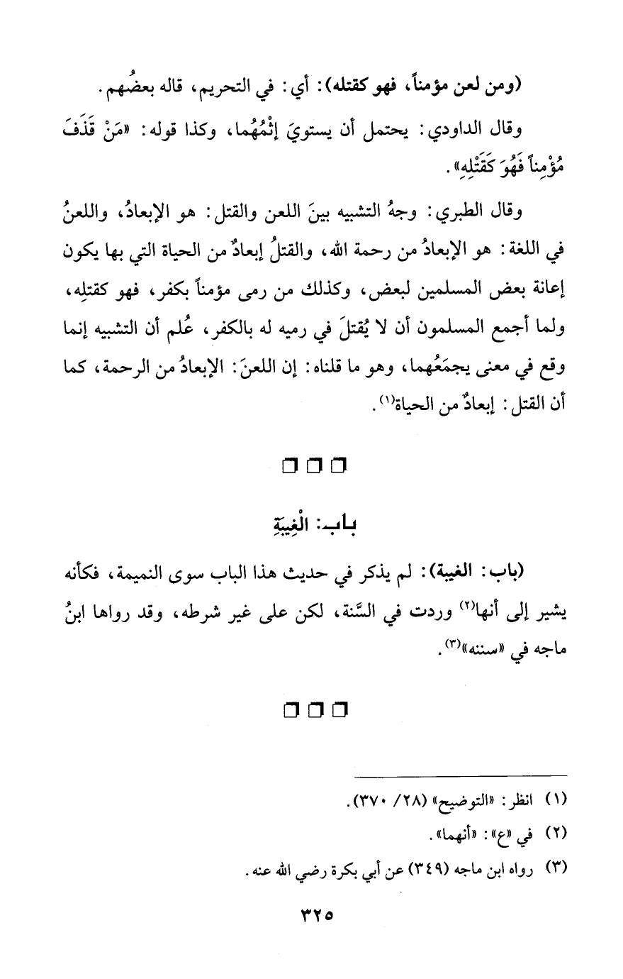 وقال الطبري: وجهُ التشبيه بينَ اللعن والقتل: هو الإبعادُ، واللعنُ في اللغة: هو الإبعادُ من رحمة الله، والقتلُ إبعادٌ من الحياة التي بها يكون إعانة بعض المسلمين لبعض، وكذلك من رمى مؤمناً بكفر، فهو كقتلِه، ولما أجمع المسلمون أن لا يُقتلَ في رميه له بالكفر، عُلم أن التشبيه إنما وقع في معنى يجمَعُهما، وهو ما قلناه: إن اللعنَ: الإبعادُ من الرحمة، كما أن القتل: إبعادٌ من الحياة (¬1).