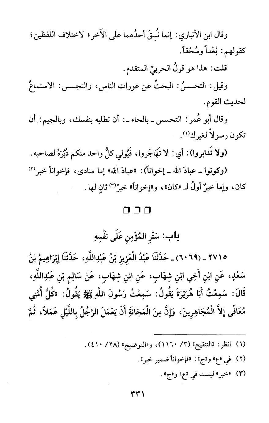 (وكونوا - عبادَ الله - إخواناً): "عبادَ الله" إما منادى، فإخواناً خبر (¬2) كان، وإما خبرٌ أولُ لـ "كان"، و"إخواناً" خبرٌ (¬3) ثانٍ لها.