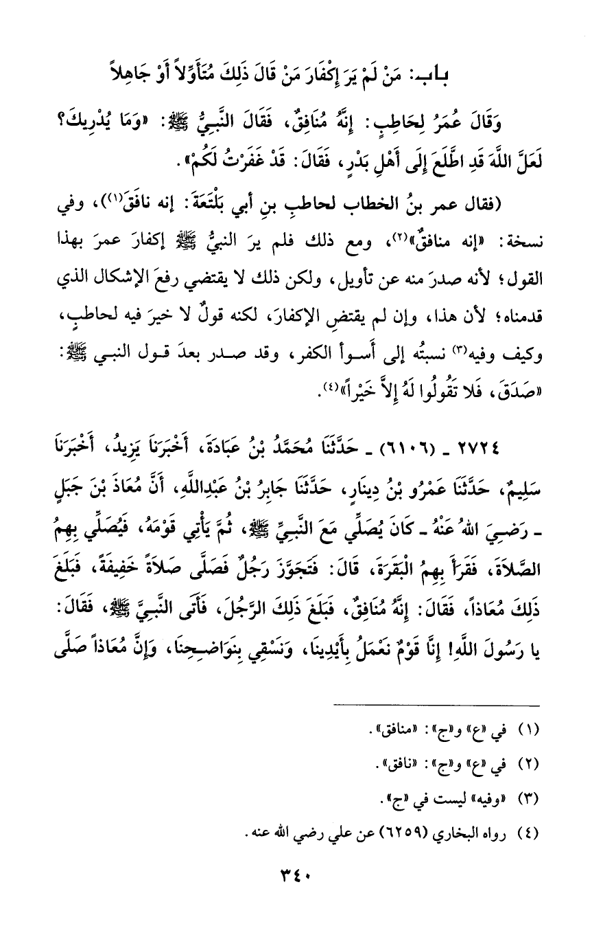 وَقَالَ عُمَرُ لِحَاطِبٍ: إِنَّهُ مُنَافِقٌ، فَقَالَ النَّبِيُّ - صلى الله عليه وسلم -: "وَمَا يُدرِيكَ؟ لَعَلَّ اللَّه قَدِ اطَّلَعَ إِلَى أَهْلِ بَدْرٍ، فَقَالَ: قَدْ غَفَرْتُ لَكُمْ".