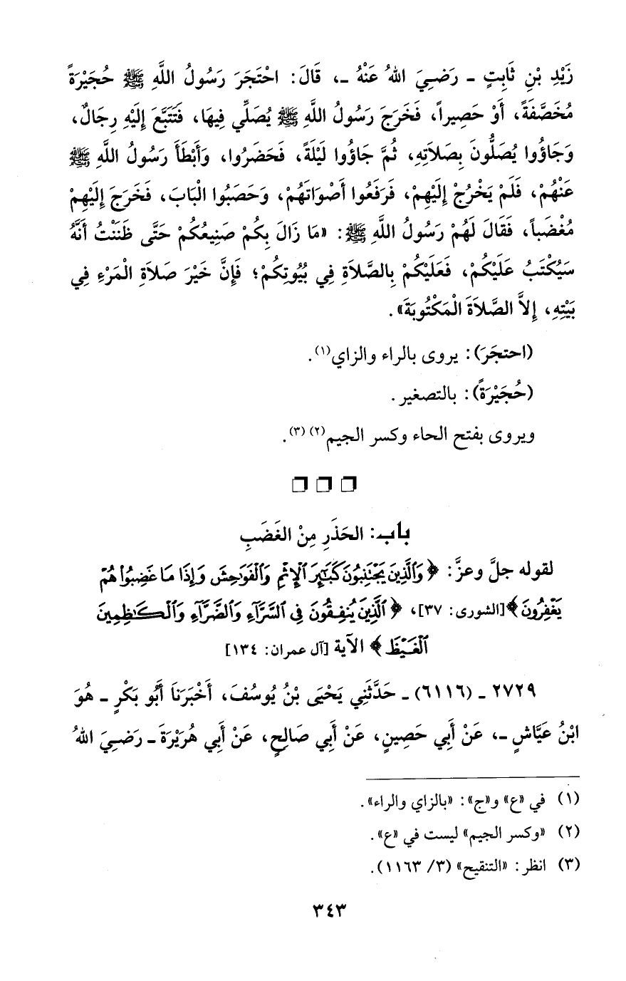 زَيْدِ بْنِ ثَابِتٍ - رَضِيَ اللهُ عَنْهُ -، قَالَ: احْتَجَرَ رَسُولُ اللَّهِ - صلى الله عليه وسلم - حُجَيْرَةً مُخَصَّفَةً، أَوْ حَصِيراً، فَخَرَجَ رَسُولُ اللَّهِ - صلى الله عليه وسلم - يُصَلِّي فِيها، فَتَتَبَّعَ إِلَيْهِ رِجَالٌ، وَجَاؤُوا يُصَلُّونَ بِصَلاَتِهِ، ثُمَّ جَاؤُوا لَيْلَةً، فَحَضَرُوا، وَأَبْطأَ رَسُولُ اللَّهِ - صلى الله عليه وسلم - عَنْهُمْ، فَلَمْ يَخْرُجْ إِلَيْهِمْ، فَرَفَعُوا أَصْوَاتَهُمْ، وَحَصَبُوا الْبَابَ، فَخَرَجَ إِلَيْهِمْ مُغْضَباً، فَقَالَ لَهُمْ رَسُولُ اللَّهِ - صلى الله عليه وسلم -: "مَا زَالَ بِكُمْ صَنِيعُكُمْ حَتَّى ظَنَنْتُ أَنَّهُ سَيُكْتَبُ عَلَيْكُمْ، فَعَلَيْكُمْ بِالصَّلاَةِ فِي بُيُوتِكُمْ؛ فَإِنَّ خَيْرَ صَلاَةِ الْمَرْءِ فِي بَيْتِهِ، إِلاَّ الصَّلاَةَ الْمَكْتُوبَةَ".