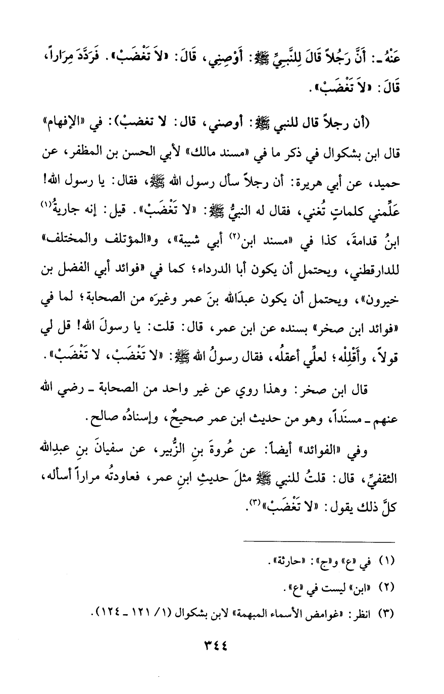 (أن رجلاً قال للنبي - صلى الله عليه وسلم -: أوصني، قال: لا تغضبْ): في "الإفهام" قال ابن بشكوال في ذكر ما في "مسند مالك" لأبي الحسن بن المظفر، عن حميد، عن أبي هريرة: أن رجلاً سأل رسول الله - صلى الله عليه وسلم -، فقال: يا رسول الله! عَلَّمني كلماتٍ تُغني، فقال له النبيُّ - صلى الله عليه وسلم -: "لا تَغْضَبْ". قيل: إنه جاريةُ (¬1) ابنُ قدامةَ، كذا في "مسند ابن (¬2) أبي شيبة"، و"المؤتلف والمختلف" للدارقطني، ويحتمل أن يكون أبا الدرداء؛ كما في "فوائد أبي الفضل بن خيرون"، ويحتمل أن يكون عبدَ الله بنَ عمر وغيرَه من الصحابة؛ لما في "فوائد ابن صخر" بسنده عن ابن عمر، قال: قلت: يا رسولَ الله! قل لي قولاً، وأَقْلِلْه؛ لعلِّي أعقلُه، فقال رسولُ الله - صلى الله عليه وسلم -: "لا تَغْضَبْ، لا تَغْضَبْ".