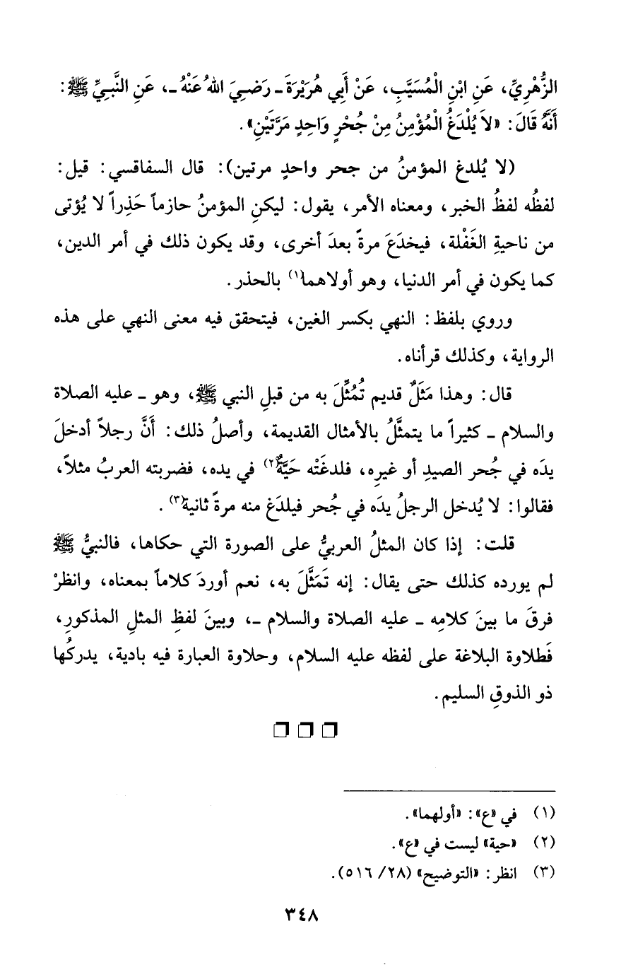الزُّهْرِيِّ، عَنِ ابْنِ الْمُسَيَّبِ، عَنْ أَبِي هُرَيْرَةَ - رَضِيَ اللهُ عَنْهُ -، عَنِ النَّبِيِّ - صلى الله عليه وسلم -: أَنَّهُ قَالَ: "لاَ يُلدَغُ الْمُؤْمِنُ مِنْ جُحْرٍ وَاحِدٍ مَرَّتَيْنِ".