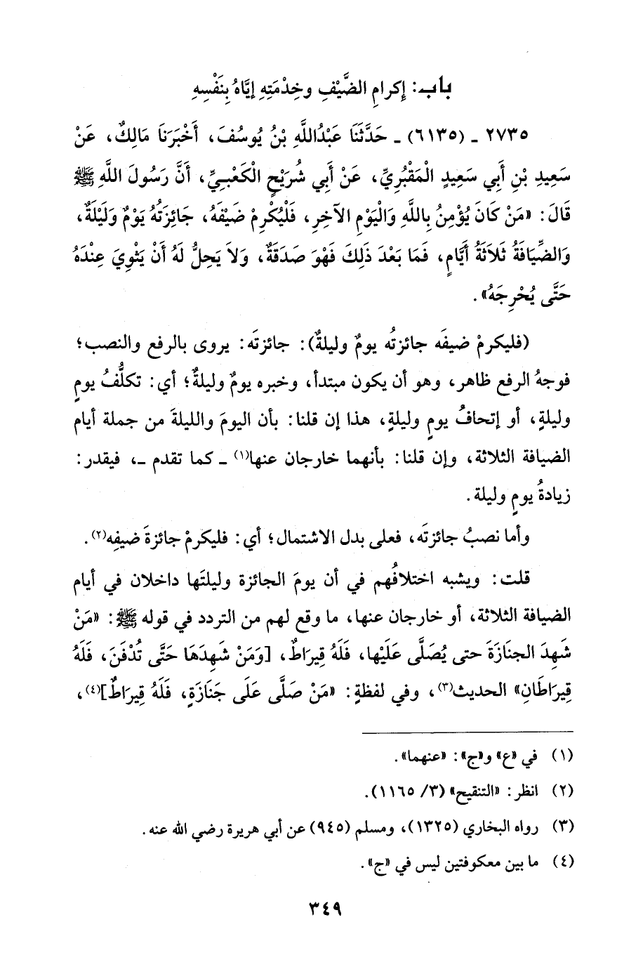 2735 - (6135) - حَدَّثَنَا عَبْدُ اللَّهِ بْنُ يُوسُفَ، أَخْبَرَنَا مَالِكٌ، عَنْ سَعِيدِ بْنِ أَبِي سَعِيدٍ الْمَقْبُرِيِّ، عَنْ أَبِي شُرَيْحِ الْكَعبِيِّ، أَن رَسُولَ اللهِ - صلى الله عليه وسلم - قَالَ: "مَنْ كَانَ يُؤْمِنُ بِاللَّهِ وَالْيَوْمِ الآخِرِ، فَلْيُكْرِمْ ضَيْفَهُ، جَائِزَتُهُ يَوْمٌ وَلَيْلَةٌ، وَالضِّيَافَةُ ثَلاَثَةُ أيَّامٍ، فَمَا بَعْدَ ذَلِكَ فَهْوَ صدَقَةٌ، وَلاَ يَحِلُّ لَهُ أَنْ يَثْوِيَ عِنْدَهُ حَتَّى يُحْرِجَه".