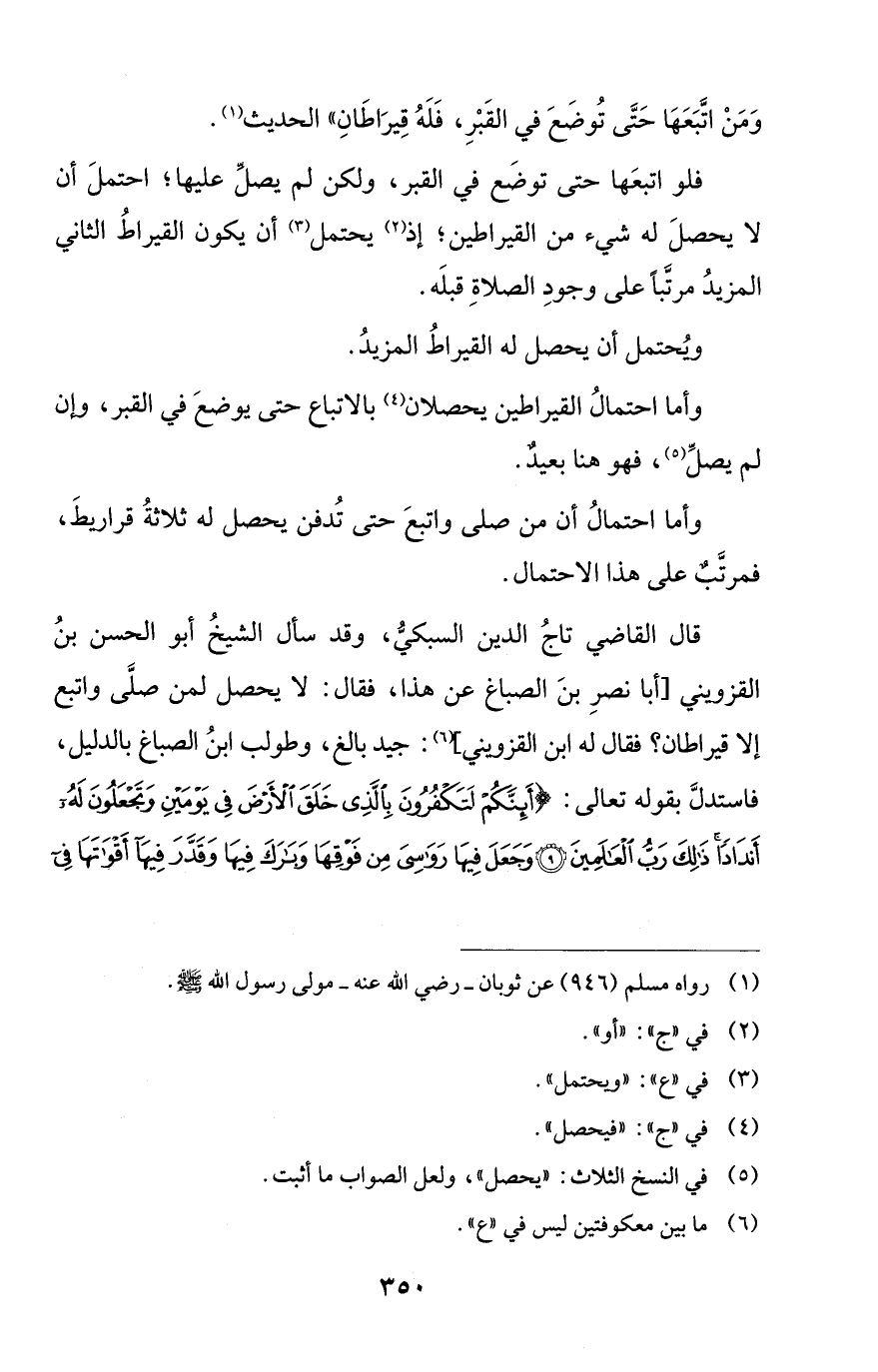 قال القاضي تاجُ الدين السبكيُّ، وقد سأل الشيخُ أبو الحسن بنُ القزويني [أبا نصرِ بنَ الصباغ عن هذا، فقال: لا يحصل لمن صلَّى واتبع إلا قيراطان؟ فقال له ابن القزويني] (¬6): جيد بالغ، وطولب ابنُ الصباغ بالدليل، فاستدلَّ بقوله تعالى: {أَئِنَّكُمْ لَتَكْفُرُونَ بِالَّذِي خَلَقَ الْأَرْضَ فِي يَوْمَيْنِ وَتَجْعَلُونَ لَهُ أَنْدَادًا ذَلِكَ رَبُّ الْعَالَمِينَ (9) وَجَعَلَ فِيهَا رَوَاسِيَ مِنْ فَوْقِهَا وَبَارَكَ فِيهَا وَقَدَّرَ فِيهَا أَقْوَاتَهَا فِي