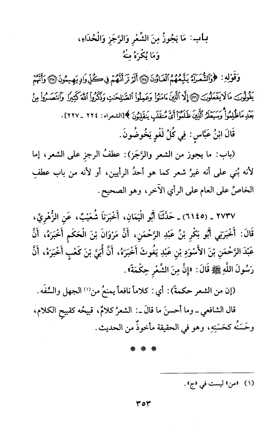 قال الشافعي - وما أحسنَ ما قالَ -: الشعرُ كلامٌ، قبيحُه كقبيحِ الكلام، وحَسَنُه كحَسَنِهِ، وهو في الحقيقة مأخوذٌ من الحديث.