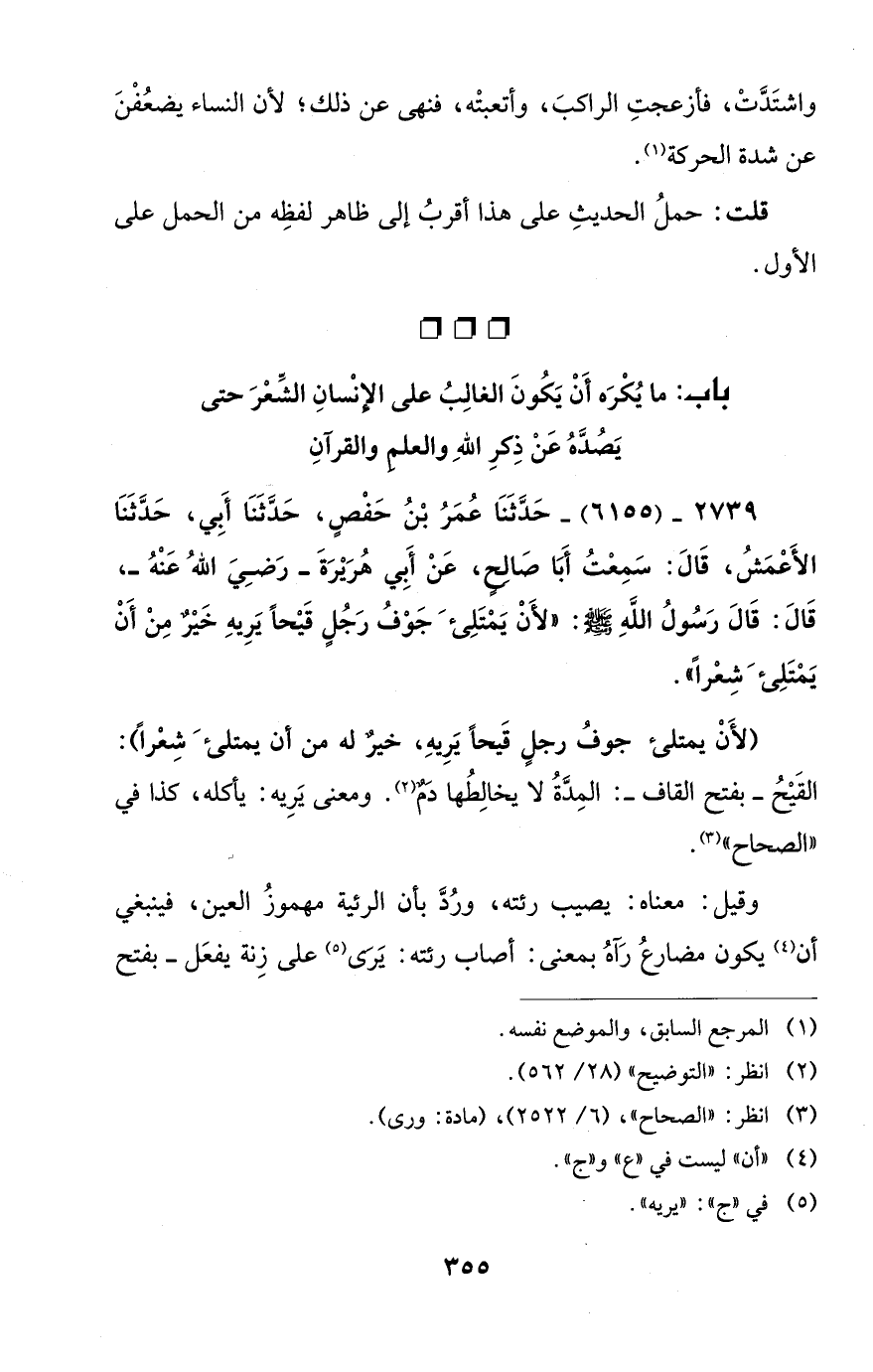 (لأَنْ يمتلئ جوفُ رجلٍ قَيحاً يَرِيهِ، خيرٌ له من أن يمتلئَ شِعْراً): القَيْحُ - بفتح القاف -: المِدَّةُ لا يخالِطُها دَمٌ (¬2). ومعنى يَرِيه: يأكله، كذا في "الصحاح" (¬3).