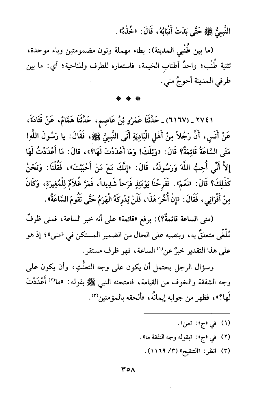 2741 - (6167) - حَدَّثَنَا عَمْرُو بْنُ عَاصِمٍ، حَدَّثَنَا همَّامٌ، عَنْ قتادَةَ، عَنْ أَنَسٍ، أَنَّ رَجُلاً مِنْ أَهْلِ الْبَادِيَةِ أَتَى النَّبِيَّ - صلى الله عليه وسلم -، فَقَالَ: يا رَسُولَ اللَّهِ! مَتَى السَّاعَةُ قَائِمَةٌ؟ قَالَ: "وَيْلَكَ! وَمَا أَعْدَدْتَ لَهَا؟ "، قالَ: مَا أَعْدَدْتُ لَهَا إِلاَّ أَنَّي أُحِبُّ الله وَرَسُولَهُ، قَالَ: "إِنَّكَ مَعَ مَنْ أَحْبَبْتَ"، فَقُلْنَا: وَنَحْنُ كَذَلِكَ؟ قَالَ: "نَعَمْ". فَفَرِحْنَا يَوْمَئِذٍ فَرَحاً شَدِيداً، فَمَرَّ غُلاَمٌ لِلْمُغِيرَةِ، وَكَانَ مِنْ أَقْرانِي، فَقَالَ: "إِنْ أُخِّرَ هذَا، فَلَنْ يُدرِكَهُ الْهَرَمُ حَتَّى تَقُومَ السَّاعَةُ".