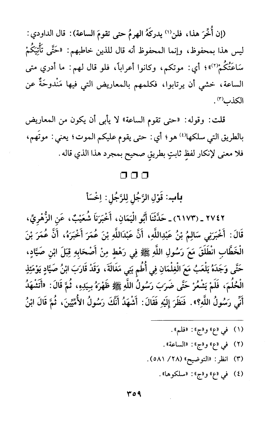 2742 - (6173) - حَدَّثَنَا أَبُو الْيَمَانِ، أَخْبَرَنَا شُعَيْبٌ، عَنِ الزُّهْرِيِّ، قَالَ: أَخْبَرَنِي سَالِمُ بْنُ عَبْدِ اللَّهِ، أَنَّ عَبْدَ اللَّهِ بْنَ عُمَرَ أَخْبَرَهُ، أَنَّ عُمَرَ بْنَ الْخَطَّابِ انْطَلَقَ مَعَ رَسُولِ اللَّهِ - صلى الله عليه وسلم - فِي رَهْطٍ مِنْ أَصحَابِهِ قِبَلَ ابْنِ صَيَّادٍ، حَتَّى وَجَدَهُ يَلْعَبُ مَعَ الْغِلْمَانِ فِي أُطُمِ بني مَغَالَةَ، وَقَد قَارَبَ ابْنُ صَيَّادٍ يَوْمَئِذٍ الْحُلُمَ، فَلم يَشْعُرْ حَتَّى ضَرَبَ رَسُولُ اللَّهِ - صلى الله عليه وسلم - ظَهْرَهُ بِيَدِهِ، ثُمَّ قَالَ: "أتَشْهَدُ أَنَّي رَسُولُ اللَّهِ؟ ". فَنَظَرَ إِلَيْهِ فَقَالَ: أَشْهَدُ أَنَّكَ رَسُولُ الأُمِّيِّينَ، ثُمَّ قَالَ ابْنُ