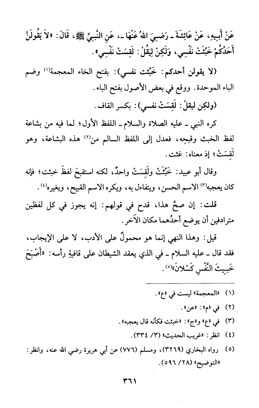 عَنْ أَبِيهِ، عَنْ عَائِشَةَ - رَضِيَ اللهُ عَنْها -، عَنِ النَّبِيِّ - صلى الله عليه وسلم -، قَالَ: "لاَ يَقُولَنَّ أَحَدُكُمْ خَبُثَتْ نَفْسِي، وَلَكِنْ لِيَقُلْ: لَقِسَتْ نَفْسِي".