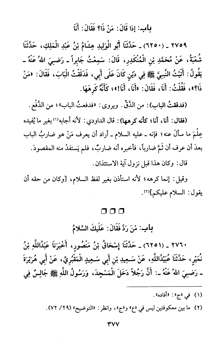 2759 - (6250) - حَدَّثَنَا أَبُو الْوَلِيدِ هِشَامُ بْنُ عَبْدِ الْمَلِكِ، حَدَّثَنَا شُعْبَةُ، عَنْ مُحَمَّدِ بْنِ الْمُنْكَدِرِ، قَالَ: سَمِعْتُ جَابِراً - رَضِيَ اللهُ عَنْهُ - يَقُولُ: أَتَيْتُ النَّبِيَّ - صلى الله عليه وسلم - فِي دَيْنٍ كَانَ عَلَى أَبِي، فَدَقَقْتُ الْبَابَ، فَقَالَ: "مَنْ ذَا؟ "، فَقُلْتُ: أَنَا، فَقَالَ: "أَنَا، أَنَا! "؛ كَأَنَّهُ كَرِهَهَا.