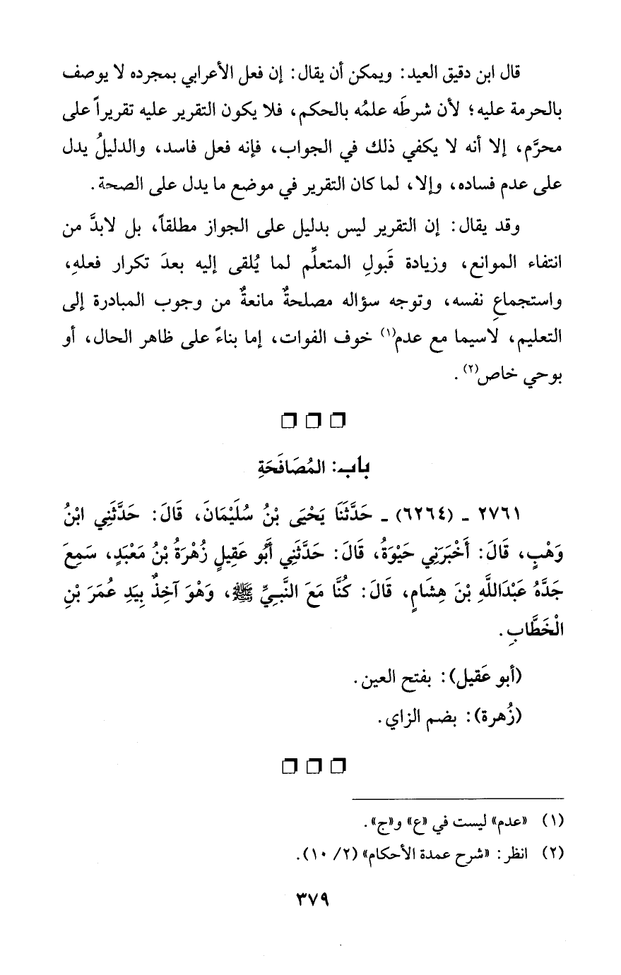 قال ابن دقيق العيد: ويمكن أن يقال: إن فعل الأعرابي بمجرده لا يوصف بالحرمة عليه؛ لأن شرطَه علمُه بالحكم، فلا يكون التقرير عليه تقريراً على محرَّم، إلا أنه لا يكفي ذلك في الجواب، فإنه فعل فاسد، والدليلُ يدل على عدم فساده، وإلا، لما كان التقرير في موضع ما يدل على الصحة.