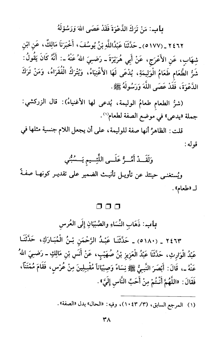 2462 - (5177) - حَدَّثَنَا عَبْدُ اللَّهِ بْنُ يُوسُفَ، أَخْبَرَنَا مَالِكٌ، عَنِ ابْنِ شِهَابٍ، عَنِ الأَعْرَجِ، عَنْ أَبِي هُرَيْرَةَ - رضي الله عنه -: أَنَّهُ كَانَ يَقُولُ: شَرُّ الطَّعَامٍ طَعَامُ الْوَليمَةِ، يُدْعَى لَهَا الأَغْنِيَاءُ، وَيُتْرَكُ الْفُقَرَاءُ، وَمَنْ تَرَكَ الدَّعْوَةَ، فقَدْ عَصَى اللَّهَ وَرَسُولَهُ - صلى الله عليه وسلم -.