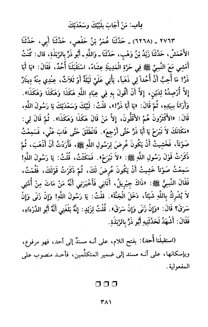 2763 - (6268) - حَدَّثَنَا عُمَرُ بْنُ حَفْصٍ، حَدَّثَنَا أَبِي، حَدَّثَنَا الأَعْمَشُ، حَدَّثَنَا زَيْدُ بْنُ وَهْبٍ، حَدَّثَنَا - وَاللَّهِ - أَبُو ذَرًّ بِالرَّبَذَةِ، قال: كُنْتُ أَمْشِي مَعَ النَّبِيِّ - صلى الله عليه وسلم - فِي حَرَّةِ الْمَدِينَةِ عِشَاءً، اسْتَقْبَلَنَا أُحُدٌ، فَقَالَ: "يَا أَبَا ذَرًّ! مَا أُحِبُّ أَنَّ أُحُداً لِي ذَهَباً، يَأْتِي عَلَيَّ لَيْلَةٌ أَوْ ثَلاَثٌ، عِنْدِي مِنْهُ دِينَارٌ إِلاَّ أُرْصِدُهُ لِدَيْنٍ، إِلاَّ أَنْ أَقُولَ بِهِ فِي عِبَادِ اللَّهِ هكَذَا وَهكَذَا وَهكَذَا". وَأَرَانَا بِيَدِهِ، ثُمَّ قَالَ: "يَا أَبَا ذَرًّ! "، قلْتُ: لَبَّيْكَ وَسَعْدَيْكَ يَا رَسُولَ اللَّهِ، قَالَ: "الأَكْثَرُونَ هُمُ الأَقَلُّونَ، إِلاَّ مَنْ قَالَ هَكَذَا وَهَكَذَا". ثُمَّ قَالَ لِي: "مَكَانَكَ لاَ تَبْرَحْ يَا أَبَا ذَرًّ حَتَّى أَرْجِعَ". فَانْطَلَقَ حَتَّى غَابَ عَنِّي، فَسَمِعْتُ صَوْتاً، فَخَشِيتُ أَنْ يَكُونَ عُرِضَ لِرَسُولِ اللَّهِ - صلى الله عليه وسلم -، فَأَرَدْتُ أَنْ أَذْهَبَ، ثُمَّ ذَكَرْتُ قَوْلَ رَسُولِ اللَّهِ - صلى الله عليه وسلم -: "لاَ تَبْرَحْ". فَمَكَثْتُ، قُلْتُ: يَا رَسُولَ اللَّهِ! سَمِعْتُ صَوْتاً خَشِيتُ أَنْ يَكُونَ عُرِضَ لَكَ، ثُمَّ ذَكَرْتُ قَوْلَكَ، فَقُمْتُ، فَقَالَ النَّبِيُّ - صلى الله عليه وسلم -: "ذَاكَ جِبْرِيلُ، أَتَانِي فَأَخْبَرَنِي أَنَّهُ مَنْ مَاتَ مِنْ أُمَّتِي لاَ يُشْرِكُ بِاللَّهِ شَيْئاً، دَخَلَ الْجَنَّةَ". قلْتُ: يَا رَسُولَ اللَّهِ! وَإِنْ زَنَى وإِنْ سَرَقَ؟ قَالَ: "وَإِنْ زَنَى وَإِنْ سَرَقَ". قُلْتُ لِزَيْدٍ: إِنَّهُ بَلَغَنِي أَنَّهُ أَبُو الدَّرْدَاءِ، فَقَالَ: أَشْهَدُ لَحَدَّثَنِيهِ أَبُو ذَرًّ بِالرَّبَذَةِ.