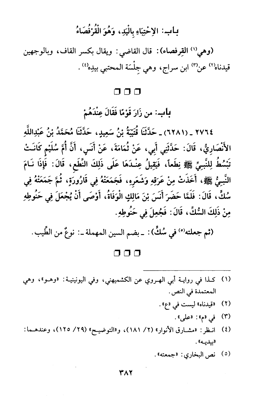 2764 - (6281) - حَدَّثَنَا قُتَيْبَةُ بْنُ سَعِيدٍ، حَدَّثَنَا مُحَمَّدُ بْنُ عَبْدِ اللَّهِ الأَنْصَارِيُّ، قَالَ: حَدَّثَنِي أَبِي، عَنْ ثُمَامَةَ، عَنْ أَنَسٍ، أَنَّ أُمَّ سُلَيْمٍ كَانَتْ تَبْسُطُ لِلنَّبِيِّ - صلى الله عليه وسلم - نِطَعاً، فَيَقِيلُ عِنْدَهَا عَلَى ذَلِكَ النِّطَعِ، قَالَ: فَإِذَا نَامَ النَّبِيُّ - صلى الله عليه وسلم -، أَخَذَتْ مِنْ عَرَقِهِ وَشَعَرِهِ، فَجَمَعَتْهُ فِي قَارُورَةٍ، ثُمَّ جَمَعَتْهُ فِي سُكًّ، قَالَ: فَلمَا حَضَرَ أَنَسَ بْنَ مَالِكٍ الْوَفَاةُ، أَوْصَى أَنْ يُجْعَلَ فِي حَنُوطِهِ مِنْ ذَلِكَ السُّكِّ، قَالَ: فَجُعِلَ فِي حَنُوطِهِ.